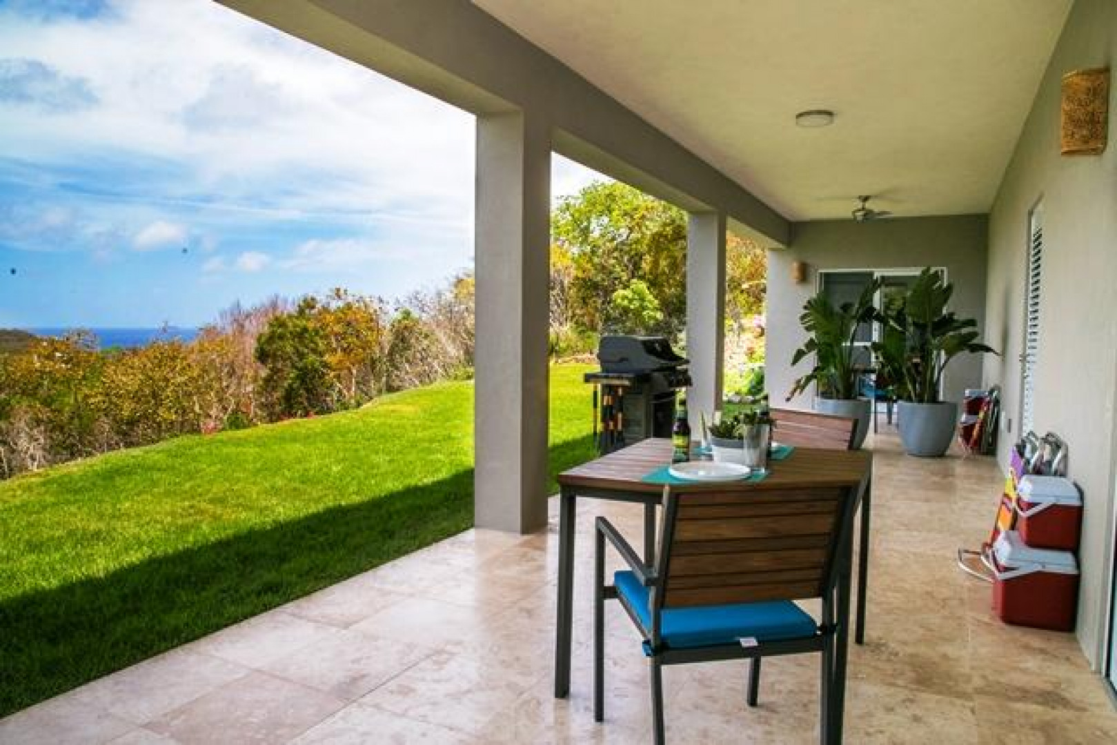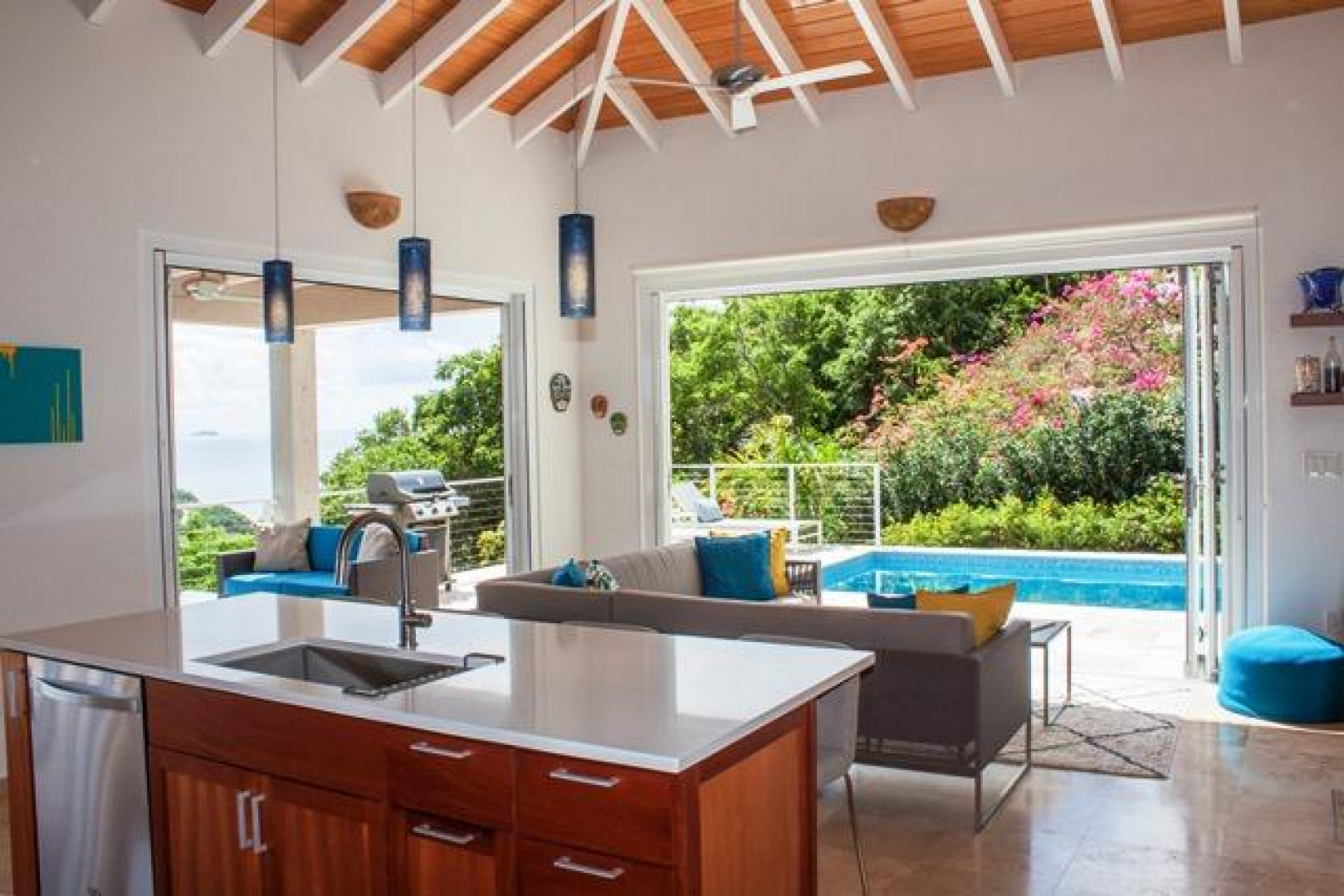 Completed in 2015, Seas the Day is a three bedroom, three bath pool villa sited on a beautifully landscaped grassy knoll in North Chocolate Hole. This villa's sleek contemporary design with multi-folding doors and rollaway screens highlights a seamless flow from indoor to outdoor living. The open layout ensures that from each fully air conditioned room you enjoy beautiful views over the Caribbean Sea out to St. Croix. Featuring high end finishes of Travertine tiled floors, Caesarstone quartz countertops and custom mahogany cabinetry, this tastefully furnished home is also highly energy efficient. Its Solar PV system with battery backup ensures you will never have power interruption and will see zero to low monthly power bills. The villa is a well known, income producing short term rental. Additional items of note include; pool heater, UV water filtration, cistern level monitoring, impact glass doors and windows and custom designed hurricane shuttering/screening system.