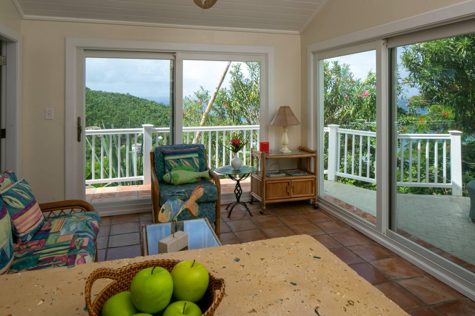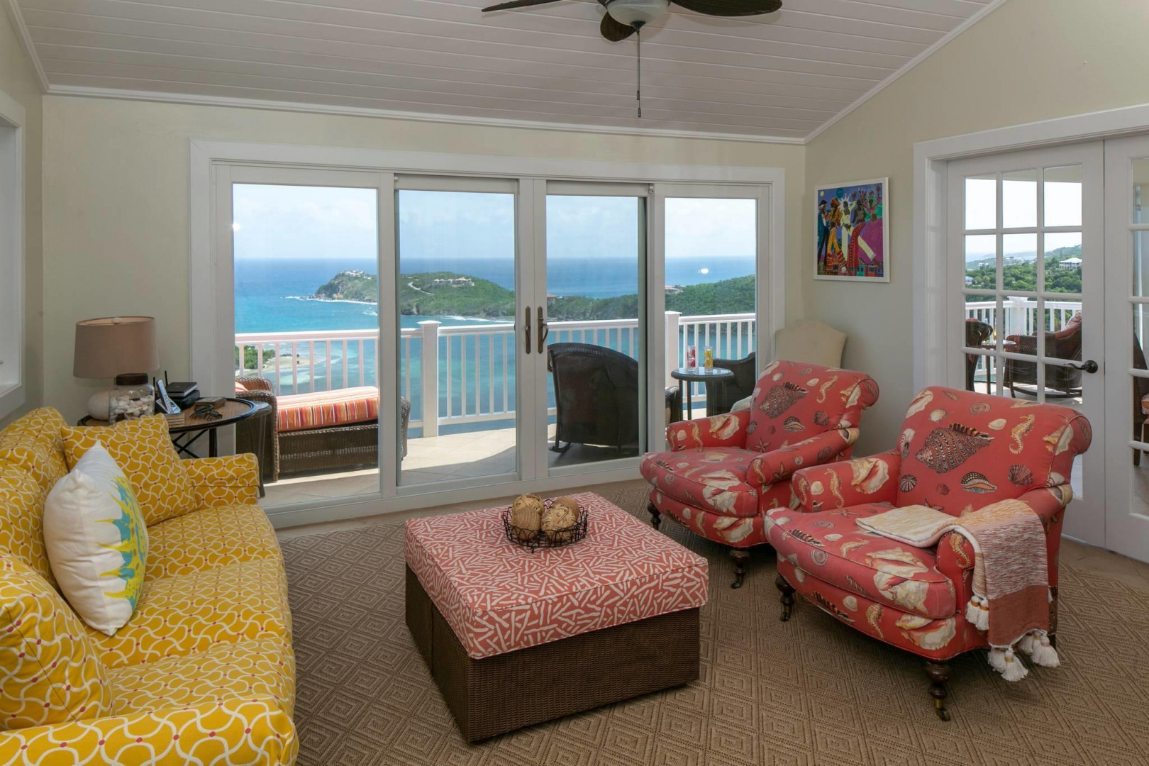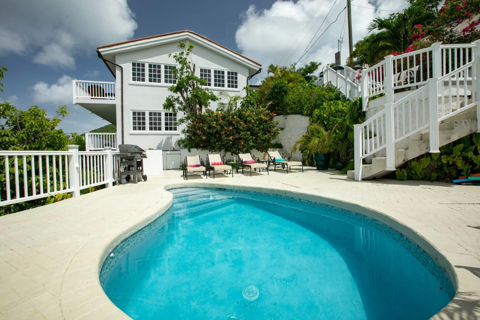 More About 63 Fish Bay, St. John, USVI, 00830Colorful 2 story Caribbean style home with one bedroom guest house separated by a lushly landscaped central pool patio. Spacious great room on upper level with bright white kitchen and comfortable living and dining areas and half bath. Below are two large bedroom suites with a large covered porch. The separate one bedroom cottage with its private entrance is tucked behind the pool patio. Private location, spectacular Fish Bay views and decorator touches throughout make this a must see.