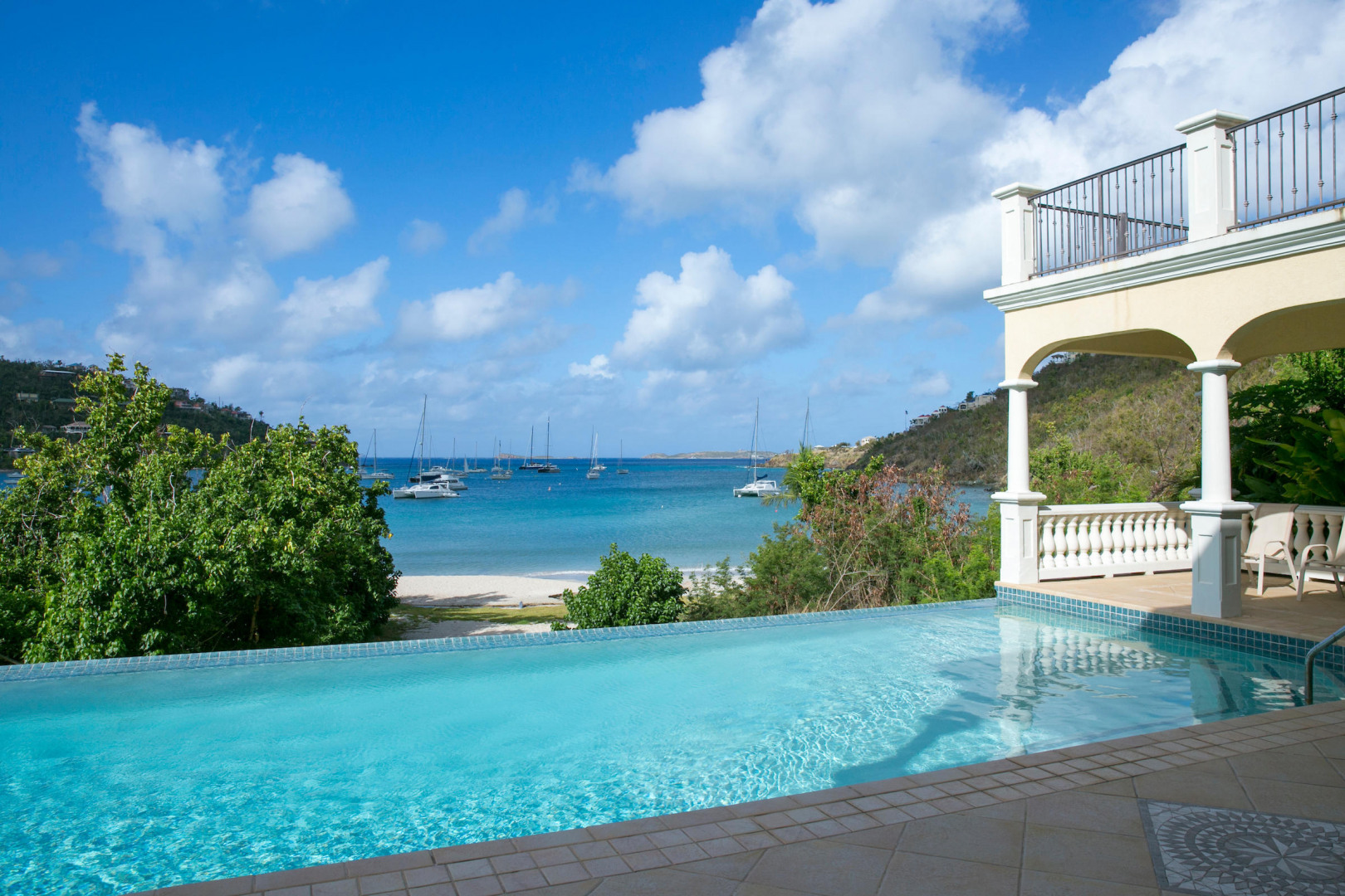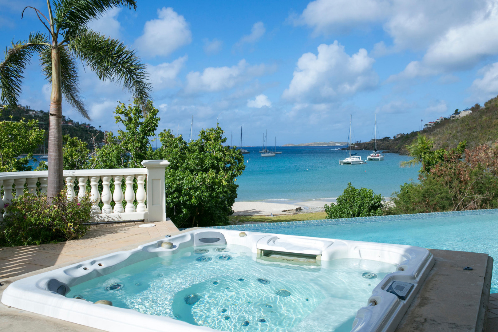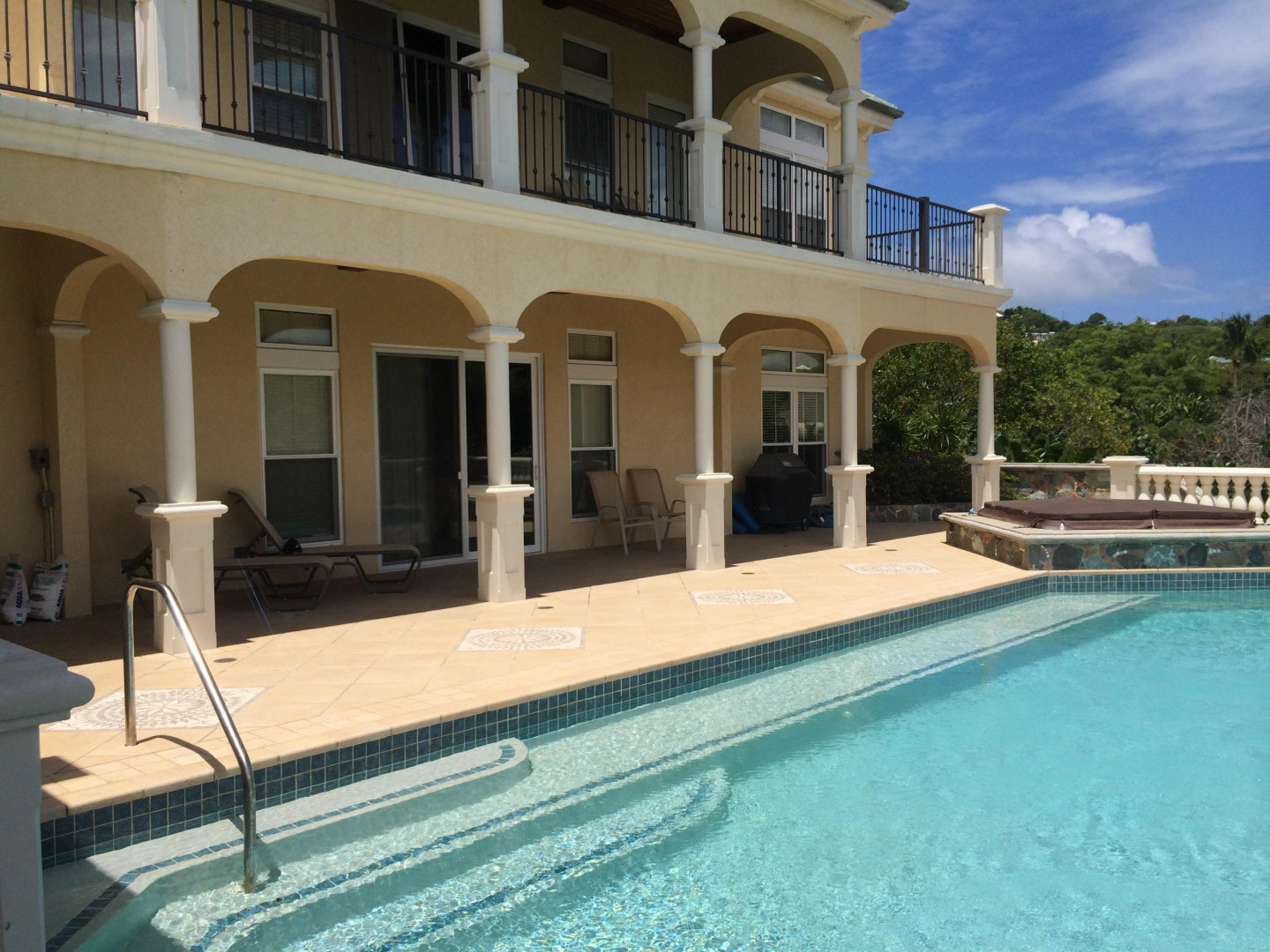 BEAUTIFUL BEACHFRONT home undamaged by storms abuts sandy beach on Great Cruz Bay! This magnificent home has every upscale amenity for your luxury lifestyle, including: 5 large bedroom suites, a spacious great room and dining area with elegant designer decor; separate office alcove and powder room off main living area. The state of the art kitchen has granite countertops and top of the line stainless steel appliances plus a separate pantry. This lovely private estate is beautifully landscaped, and affords direct beach access from over an acre of gently rising land that provides unobstructed, elevated water views of Great Cruz Bay. Very private site with boating and swimming! Walk to nearby Westin Resort. Highly desirable for short term rental with grand 16' x 40' pool and oversized spa