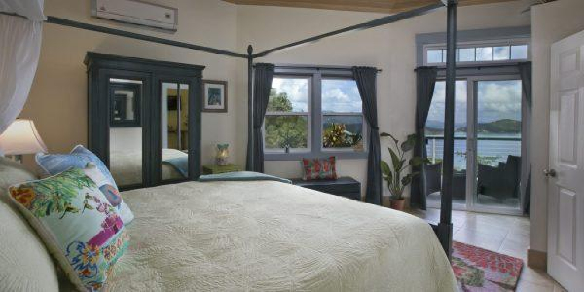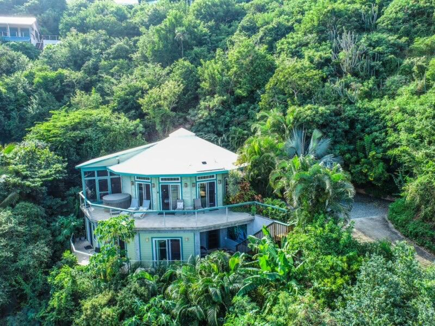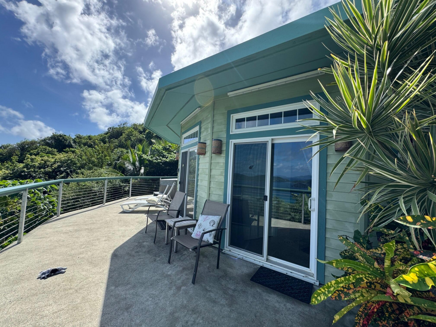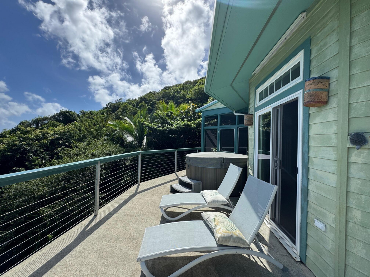 Moonglow Cottage is an octagonal Deltec home with spectacular views of Coral Bay, East End , Haulover ,Hurricane Hole and the British Virgin Islands beyond. Vistas abound from every part of this spacious Caribbean home... there are gentle breezes and an ocean view from every room! The screened outdoor dining veranda is only steps away from a well-appointed gourmet kitchen with owner-created ceramic tiles complementing the stainless steel and granite and custom cypress cabinetry. An air conditioned bedroom with a king size four-poster bed awaits after star gazing in the spa. Every attention to detail was made from floor (nonslip tiles) to ceiling (custom cypress ceiling). Down a flight of stairs takes you to a beautiful 1 bedroom / 1 bath apartment with the same gorgeous views. -
