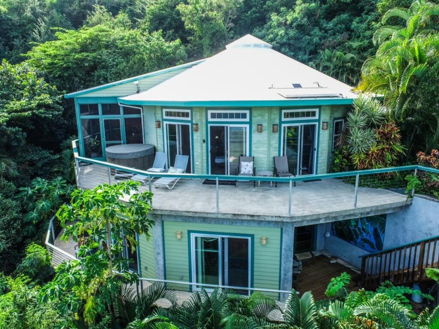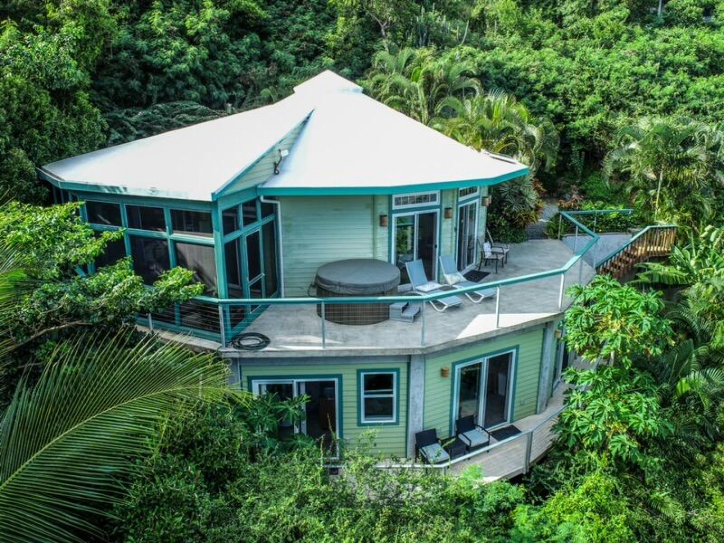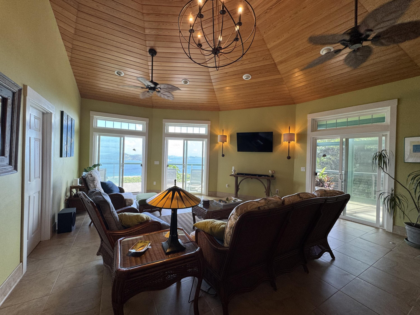 Moonglow Cottage is an octagonal Deltec home with spectacular views of Coral Bay, East End , Haulover ,Hurricane Hole and the British Virgin Islands beyond. Vistas abound from every part of this spacious Caribbean home... there are gentle breezes and an ocean view from every room! The screened outdoor dining veranda is only steps away from a well-appointed gourmet kitchen with owner-created ceramic tiles complementing the stainless steel and granite and custom cypress cabinetry. An air conditioned bedroom with a king size four-poster bed awaits after star gazing in the spa. Every attention to detail was made from floor (nonslip tiles) to ceiling (custom cypress ceiling). Down a flight of stairs takes you to a beautiful 1 bedroom / 1 bath apartment with the same gorgeous views. -