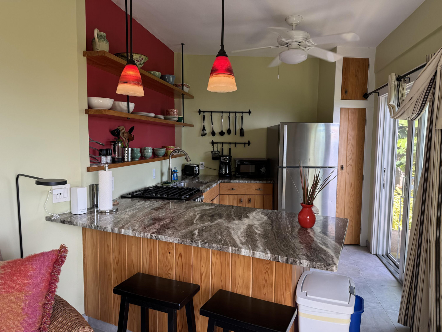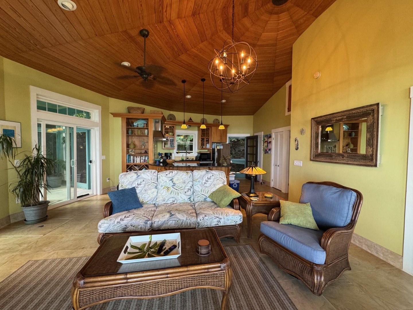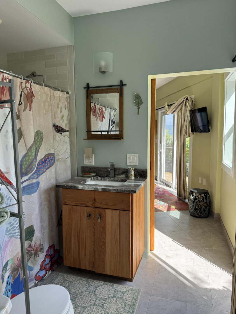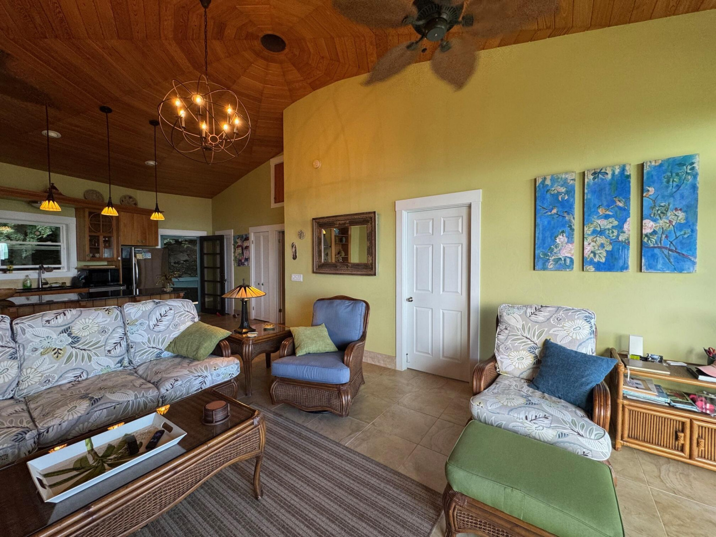 Moonglow Cottage is an octagonal Deltec home with spectacular views of Coral Bay, East End , Haulover ,Hurricane Hole and the British Virgin Islands beyond. Vistas abound from every part of this spacious Caribbean home... there are gentle breezes and an ocean view from every room! The screened outdoor dining veranda is only steps away from a well-appointed gourmet kitchen with owner-created ceramic tiles complementing the stainless steel and granite and custom cypress cabinetry. An air conditioned bedroom with a king size four-poster bed awaits after star gazing in the spa. Every attention to detail was made from floor (nonslip tiles) to ceiling (custom cypress ceiling). Down a flight of stairs takes you to a beautiful 1 bedroom / 1 bath apartment with the same gorgeous views. -