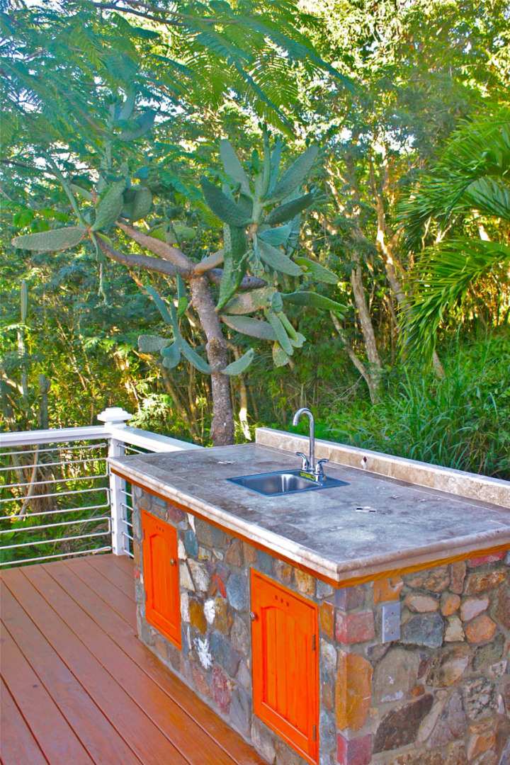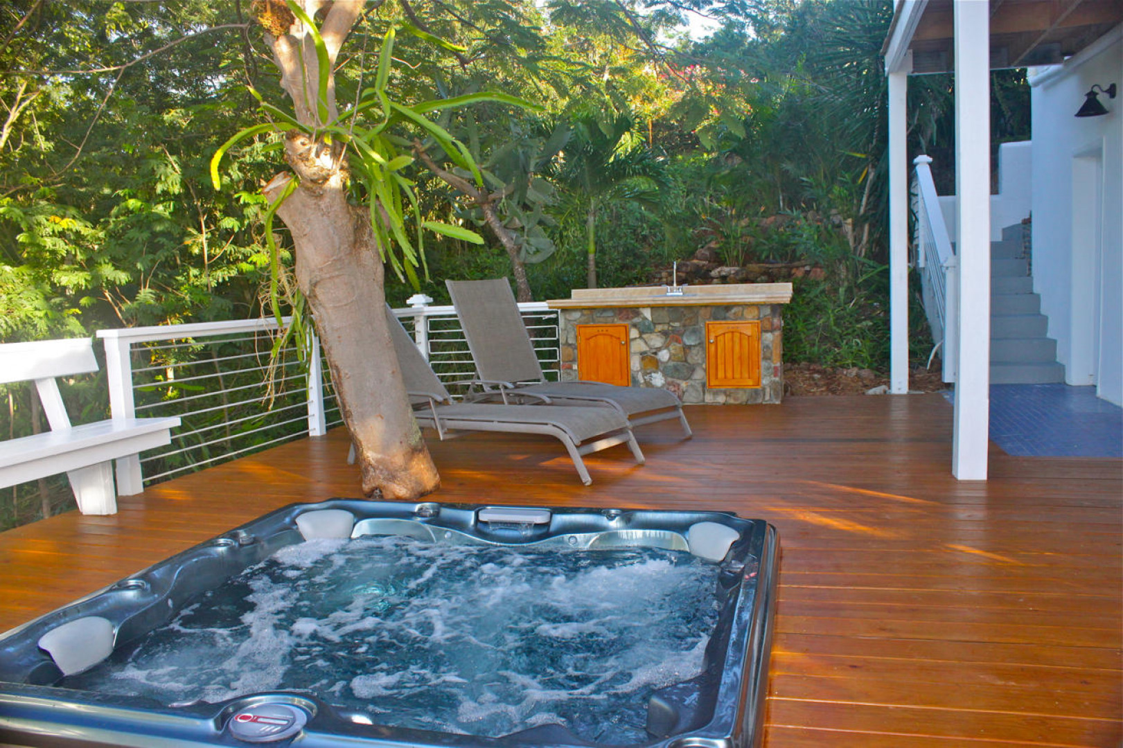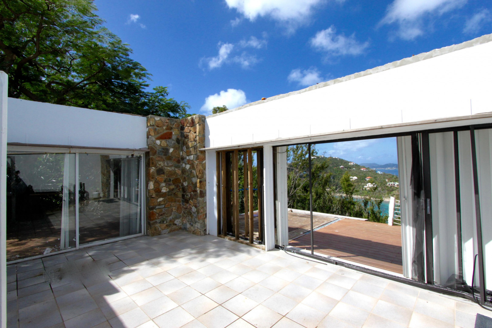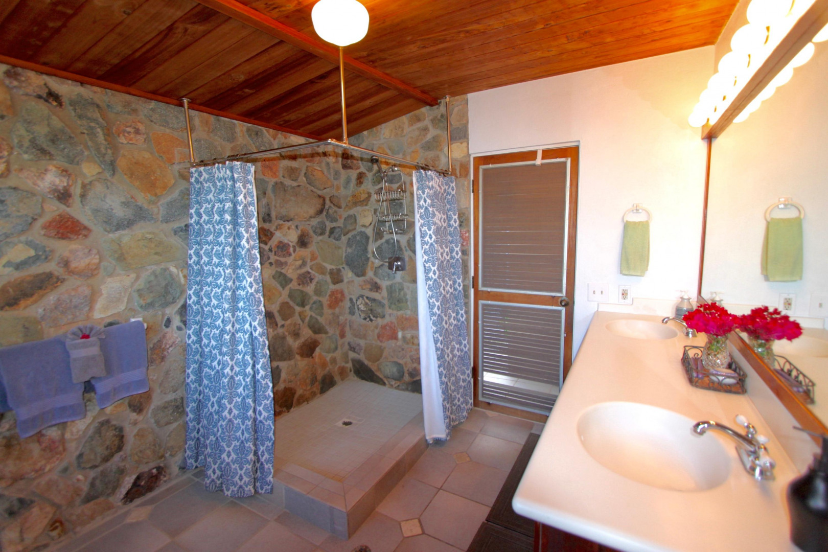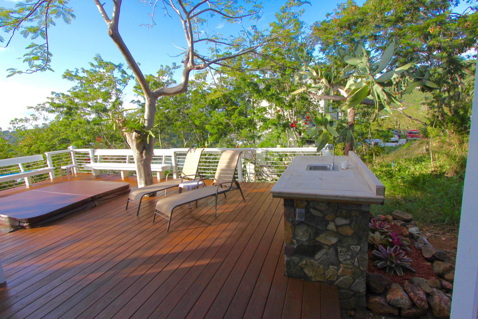 More About 45 Chocolate Hole, St. John, USVI, 00830''Sunset Cove'' Although this home sustained some hurricane damage, the lower level remains in perfect condition, leaving a blank slate with amazing views in Chocoalte Hole for the buyer. There is an expansive open deck on the lower level with a hot tub and wet bar plus a large covered deck leading to another bedroom or storage area. Could quickly be used as a two bedroom long term rental. Upper level walls are in good shape and could support a second story master bedroom. The sky is the limit with design choices on upper level. Take advantage of this blank slate in desirable Chocolate Hole. This property has deeded access to two beaches at Chocolate Hole and Hart Bay. Photos captions designate storm status. Convenient to Cruz Bay town, shops and restaurants and the Westin Resort. Buyer and Seller to split cost of Stamp Tax evenly. Sunset Cove is a solid masonry and stone home. Big Westerly views over Chocolate Hole through the open wall feature let the sunsets spill into the living room and bedrooms. With 4 bedrooms and 2 bathrooms, expansive covered and sun decks along with a hot tub, this home is a bargain in this location. 2 bedrooms upstairs share an over sized bathroom that features a classic Virgin Islands stone wall and his and her sinks. The lower level bedroom has a cypress ceiling and a huge sun deck with a hot tub and "Cactus" bar for entertaining. Upstairs, the fully equipped kitchen is spacious with stainless steel appliances and lots of room to cook. The great room has a vaulted ceiling with warm sofit lighting, and a wall for sliding glass/pocket doors that let the Westerly water views in and offers wonderful views of the fine sunsets. There was a covered dining deck just outside the great room. On the back deck near the kitchen, a full size gas grill and small dining table offers sun when the covered decks have shade, and shade from trees when the covered deck takes in the sun.