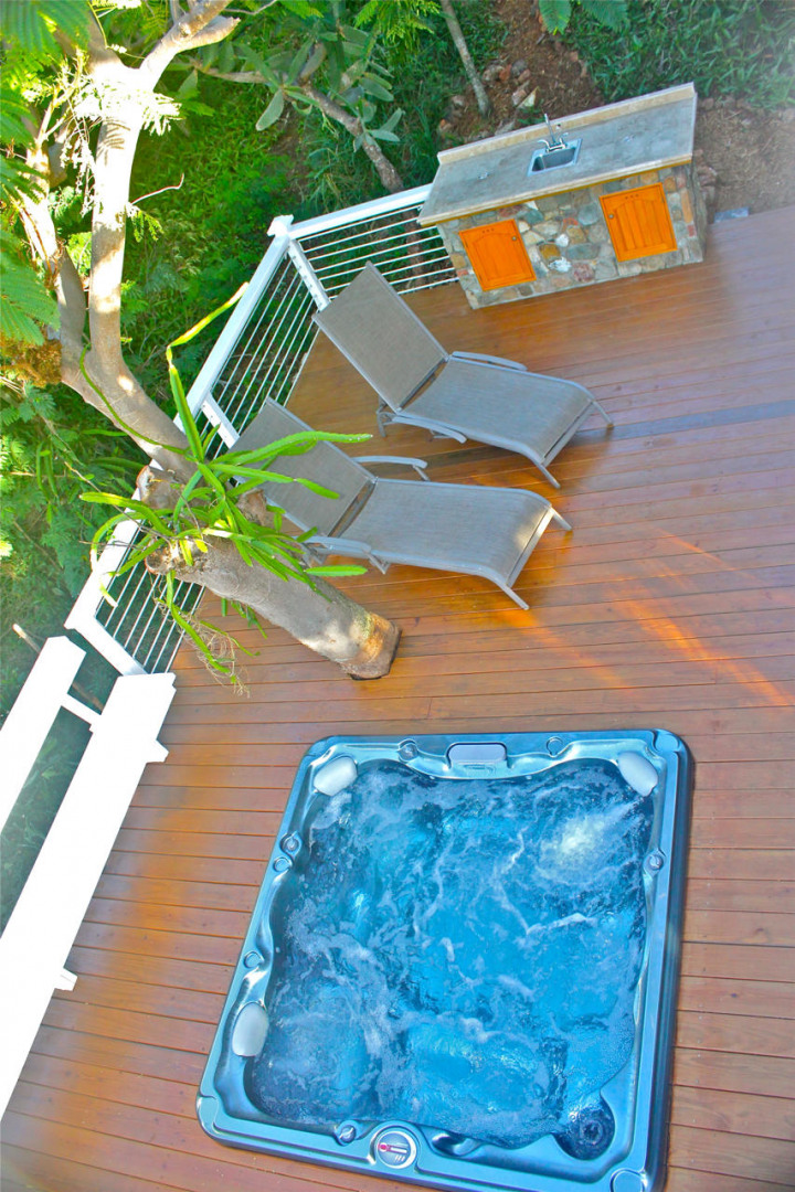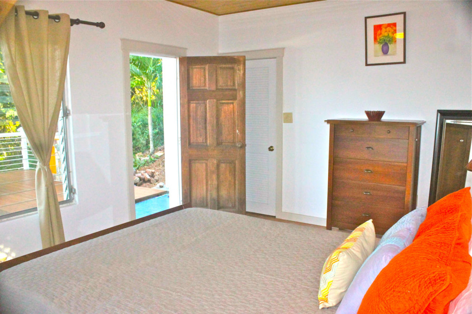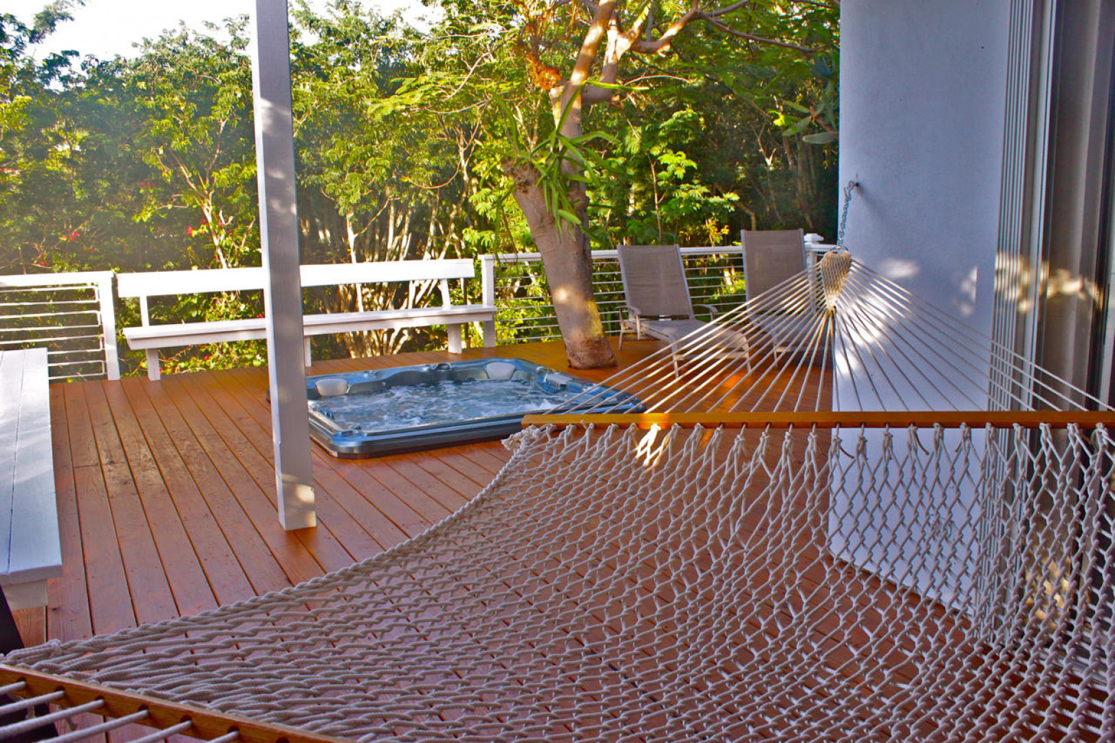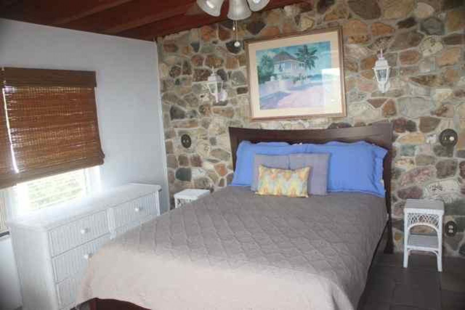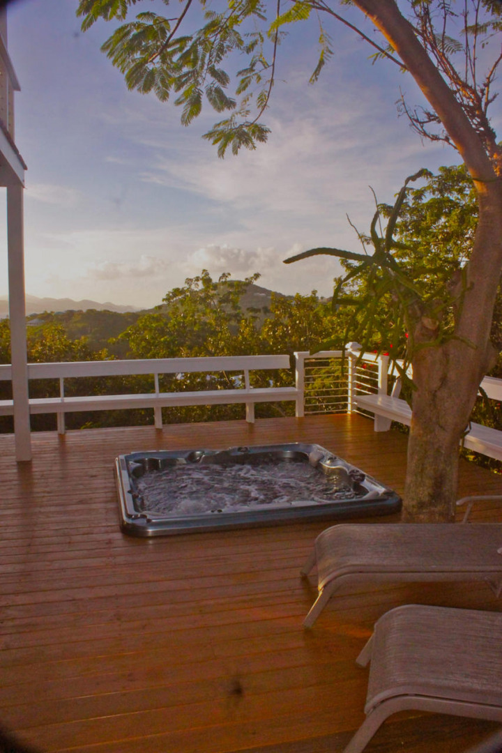More About 45 Chocolate Hole, St. John, USVI, 00830''Sunset Cove'' Although this home sustained some hurricane damage, the lower level remains in perfect condition, leaving a blank slate with amazing views in Chocoalte Hole for the buyer. There is an expansive open deck on the lower level with a hot tub and wet bar plus a large covered deck leading to another bedroom or storage area. Could quickly be used as a two bedroom long term rental. Upper level walls are in good shape and could support a second story master bedroom. The sky is the limit with design choices on upper level. Take advantage of this blank slate in desirable Chocolate Hole. This property has deeded access to two beaches at Chocolate Hole and Hart Bay. Photos captions designate storm status. Convenient to Cruz Bay town, shops and restaurants and the Westin Resort. Buyer and Seller to split cost of Stamp Tax evenly. Sunset Cove is a solid masonry and stone home. Big Westerly views over Chocolate Hole through the open wall feature let the sunsets spill into the living room and bedrooms. With 4 bedrooms and 2 bathrooms, expansive covered and sun decks along with a hot tub, this home is a bargain in this location. 2 bedrooms upstairs share an over sized bathroom that features a classic Virgin Islands stone wall and his and her sinks. The lower level bedroom has a cypress ceiling and a huge sun deck with a hot tub and "Cactus" bar for entertaining. Upstairs, the fully equipped kitchen is spacious with stainless steel appliances and lots of room to cook. The great room has a vaulted ceiling with warm sofit lighting, and a wall for sliding glass/pocket doors that let the Westerly water views in and offers wonderful views of the fine sunsets. There was a covered dining deck just outside the great room. On the back deck near the kitchen, a full size gas grill and small dining table offers sun when the covered decks have shade, and shade from trees when the covered deck takes in the sun.