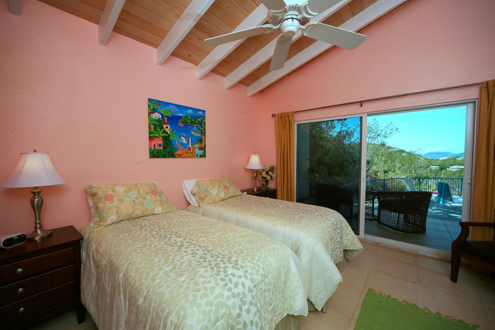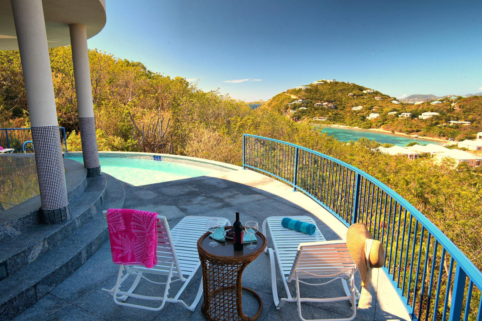 ''Samba Azul'' is a popular rental villa that boasts beautiful sunset views overlooking Chocolate Hole Bay and beyond to St. Thomas with two spacious, air conditioned bedrooms each with their own jacuzzi tub, large shower and private deck. The great room consists of a well-equipped gourmet kitchen with granite counter tops and a large comfortable living area that opens to an outdoor, covered dining area and pool. Exceptional craftsmanship throughout by the Owner/builder and should be seen to be fully appreciated. *Buyer to cooperate with documentation if Seller does a 1031 Tax Free. Exchange. -