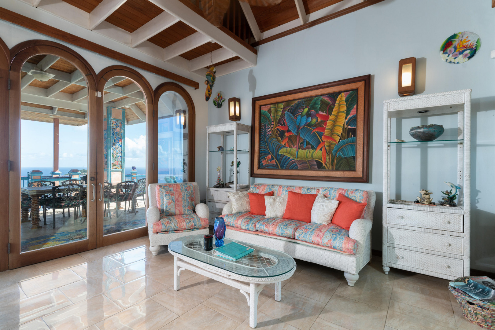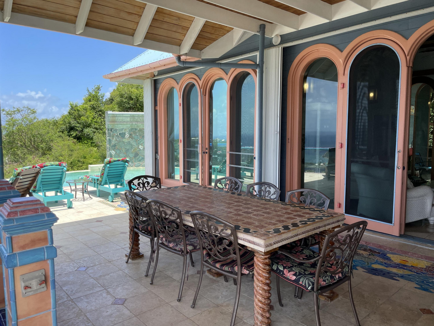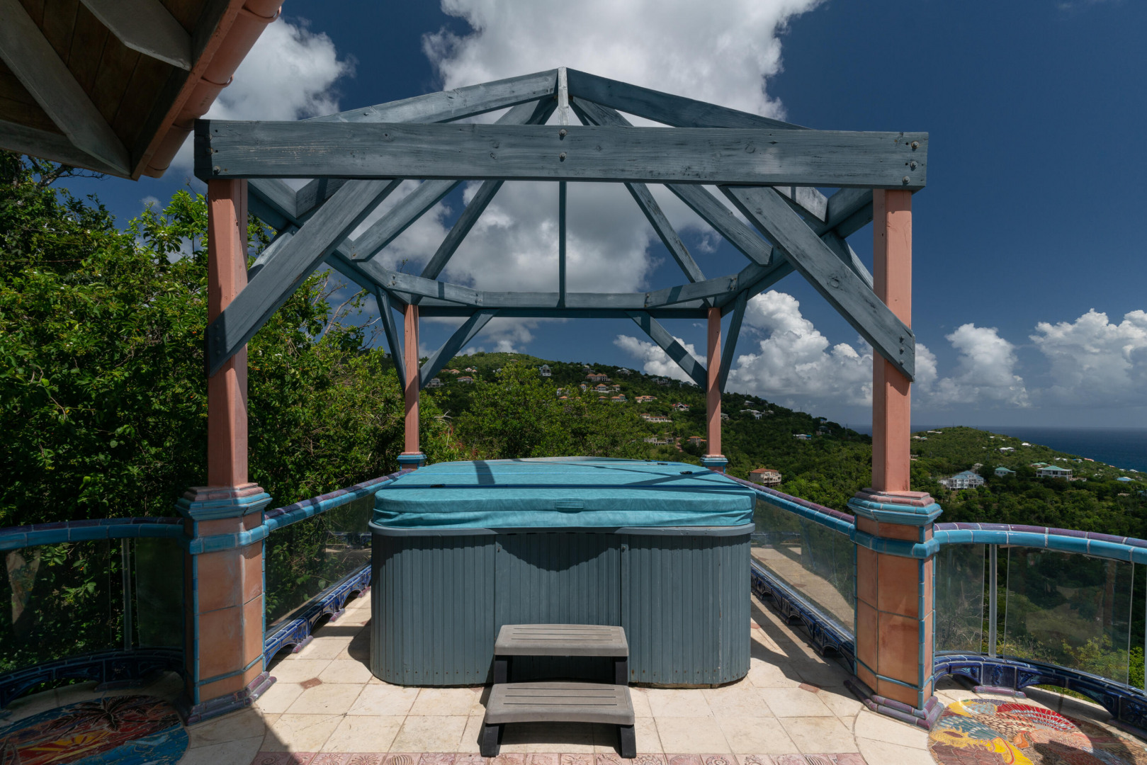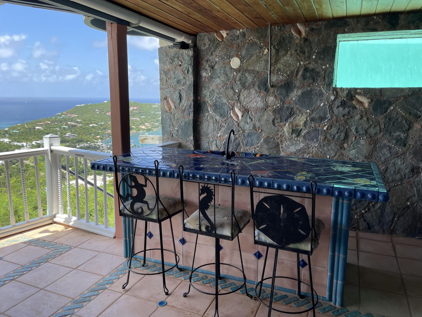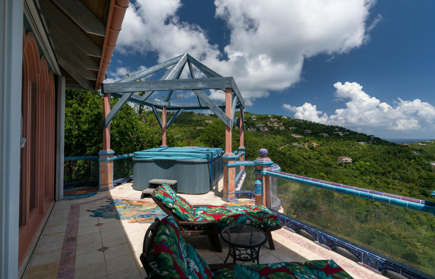 Sapphire Breeze is a 4 bedroom private villa with a pool, hot tub, and majestic views. This joyful villa is accented with Caribbean colors and custom ceramic artwork both inside and out. The two-level design of this spacious home offers plenty of room to gather, yet it also includes private areas for you to relax and enjoy some alone time. The main living area is an open floor plan, with adjoining custom designed mahogany kitchen, living and dining areas and master bedroom suites on either side. Arched 9ft high mahogany and glass French doors open to the pool deck which includes a covered gazebo with an 8 person dining table, a pool with an 8ft waterfall and a 4 person hot tub! -