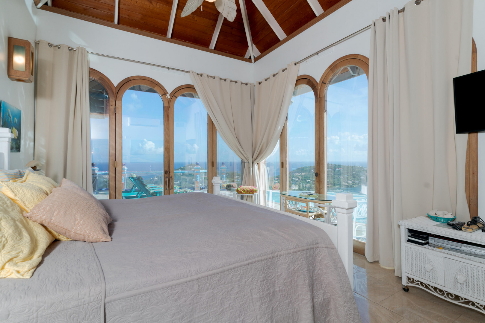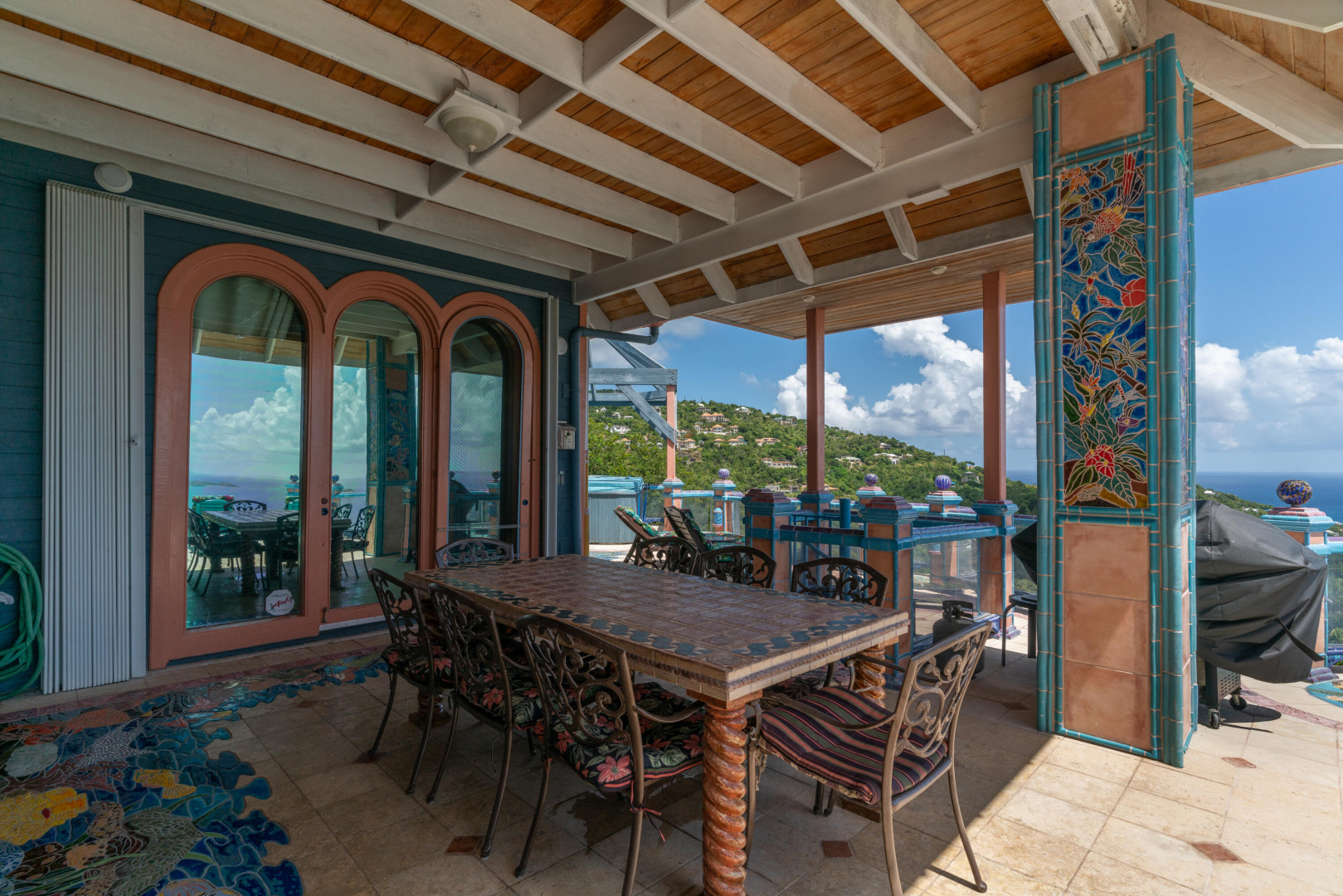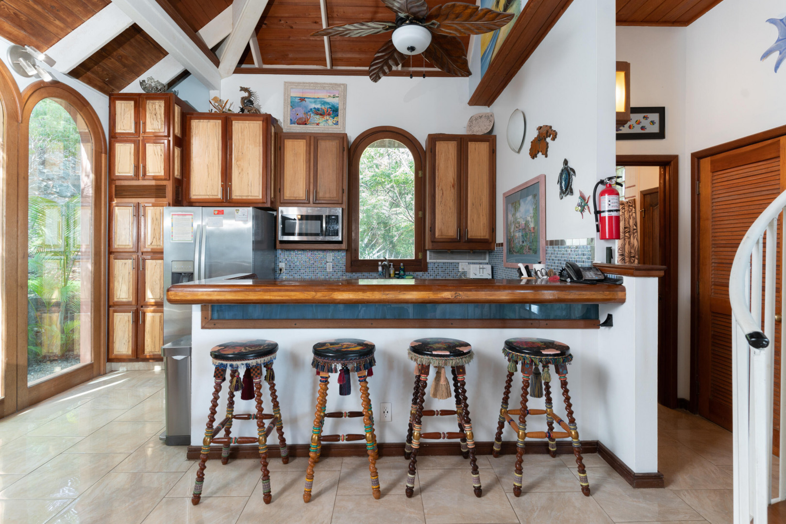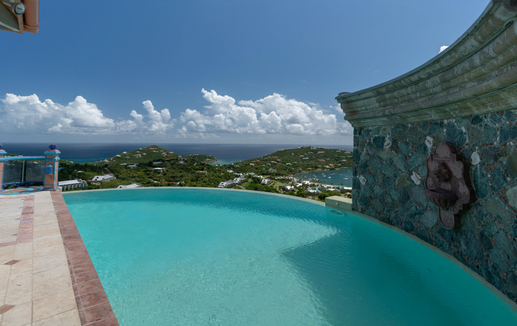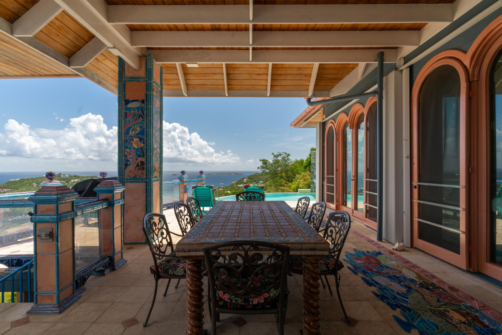 Sapphire Breeze is a 4 bedroom private villa with a pool, hot tub, and majestic views. This joyful villa is accented with Caribbean colors and custom ceramic artwork both inside and out. The two-level design of this spacious home offers plenty of room to gather, yet it also includes private areas for you to relax and enjoy some alone time. The main living area is an open floor plan, with adjoining custom designed mahogany kitchen, living and dining areas and master bedroom suites on either side. Arched 9ft high mahogany and glass French doors open to the pool deck which includes a covered gazebo with an 8 person dining table, a pool with an 8ft waterfall and a 4 person hot tub! -