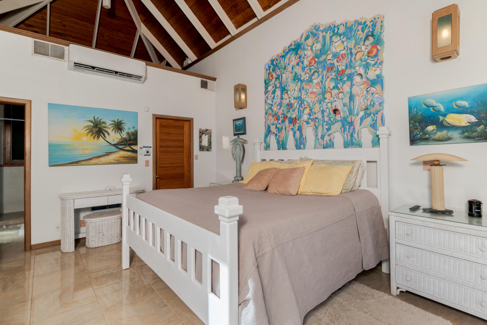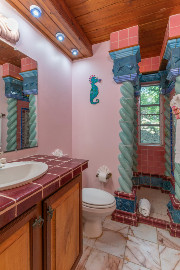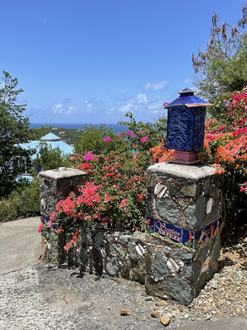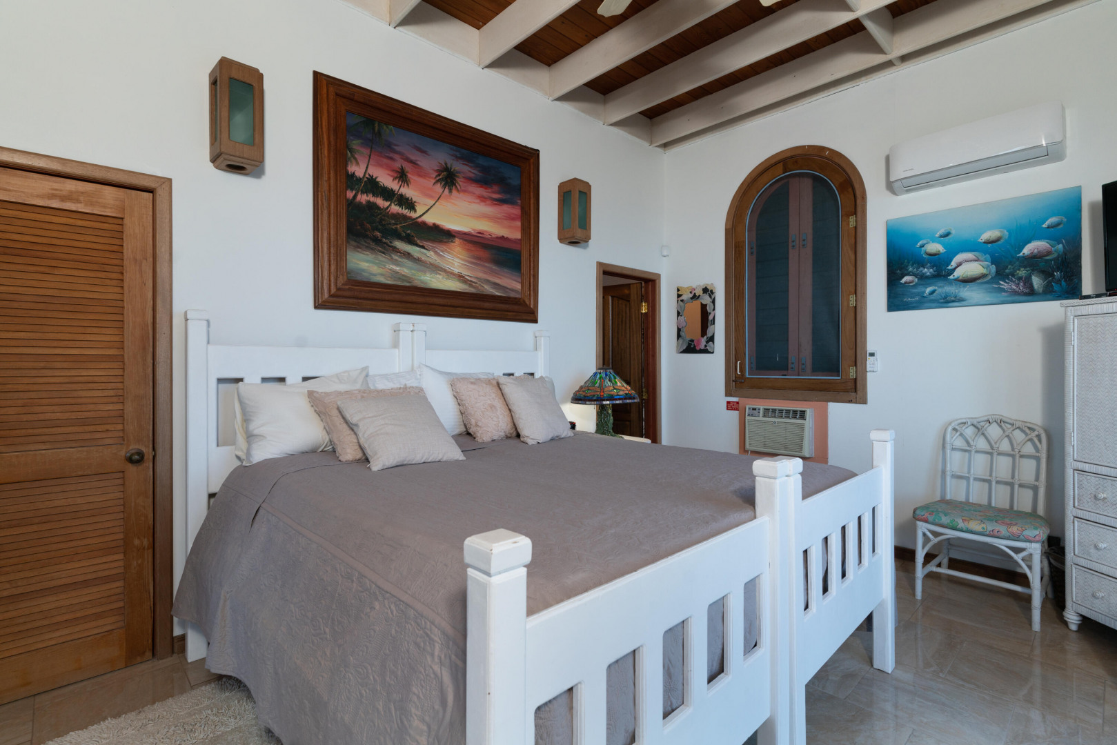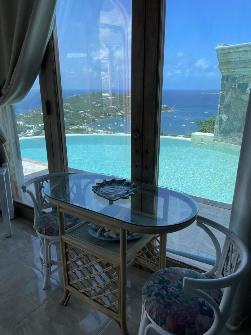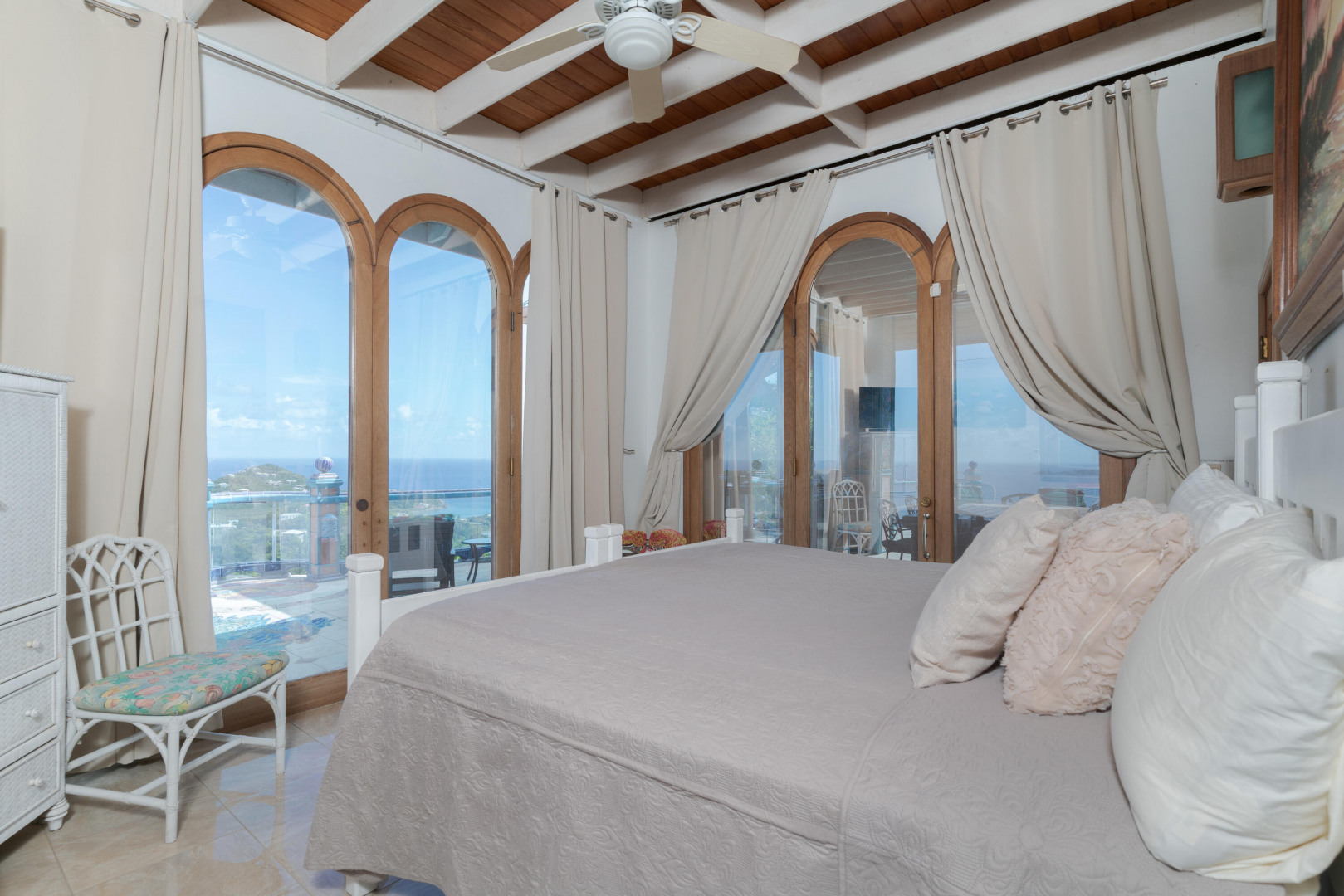 Sapphire Breeze is a 4 bedroom private villa with a pool, hot tub, and majestic views. This joyful villa is accented with Caribbean colors and custom ceramic artwork both inside and out. The two-level design of this spacious home offers plenty of room to gather, yet it also includes private areas for you to relax and enjoy some alone time. The main living area is an open floor plan, with adjoining custom designed mahogany kitchen, living and dining areas and master bedroom suites on either side. Arched 9ft high mahogany and glass French doors open to the pool deck which includes a covered gazebo with an 8 person dining table, a pool with an 8ft waterfall and a 4 person hot tub! -