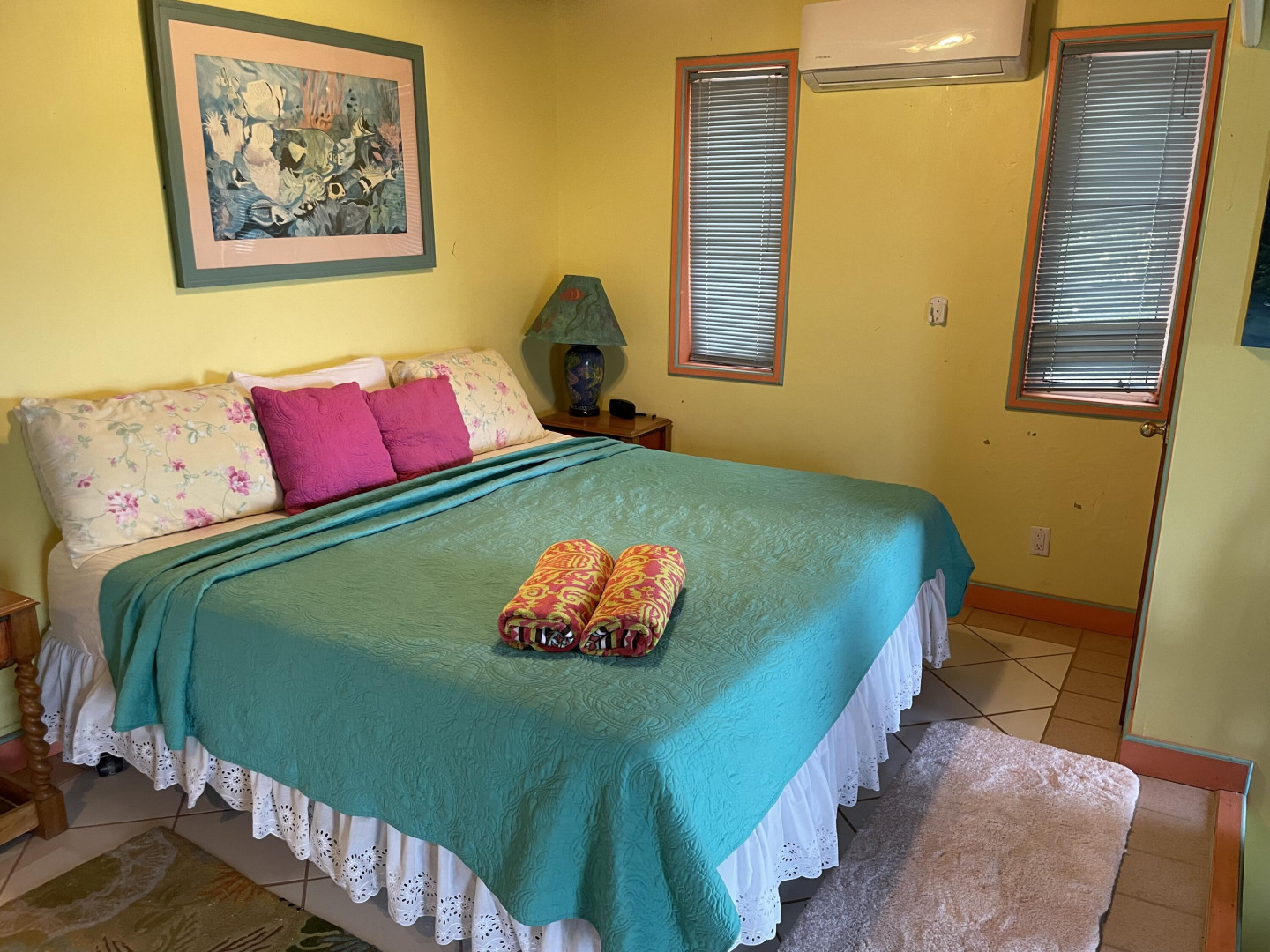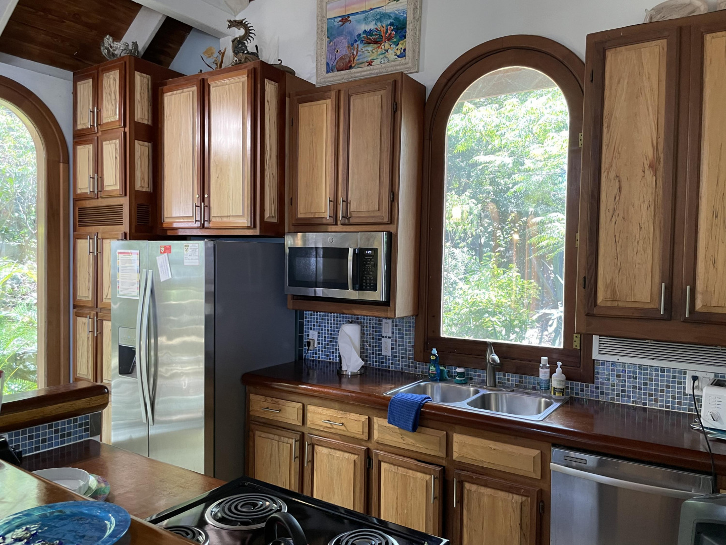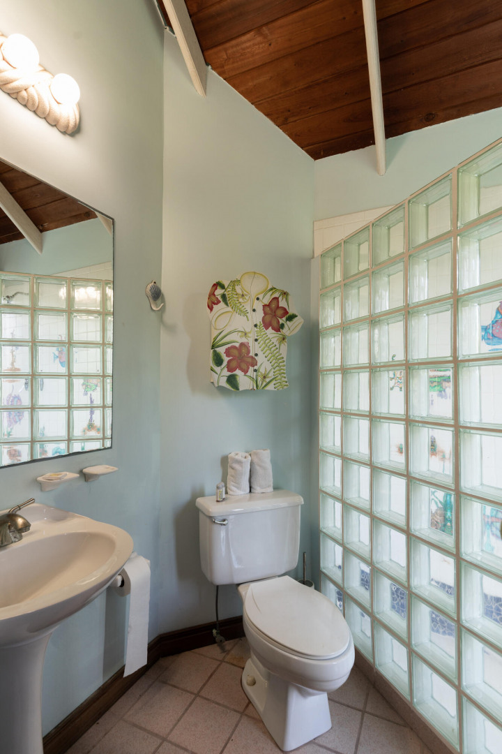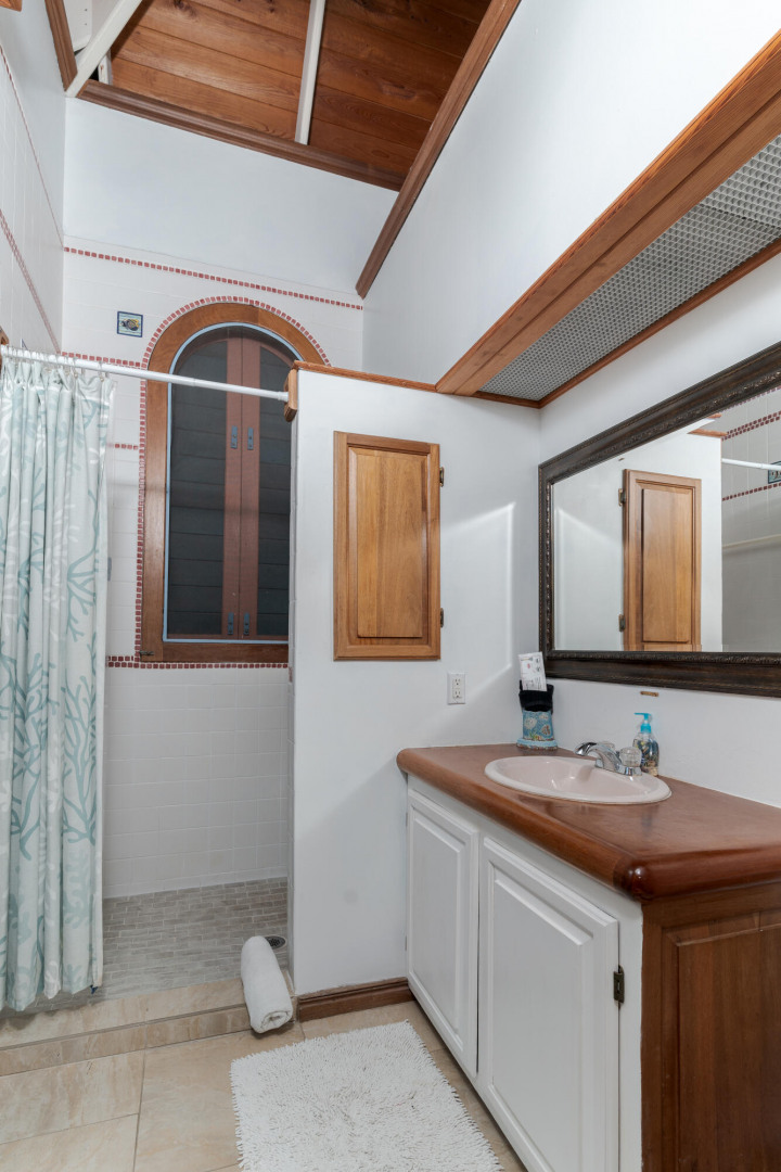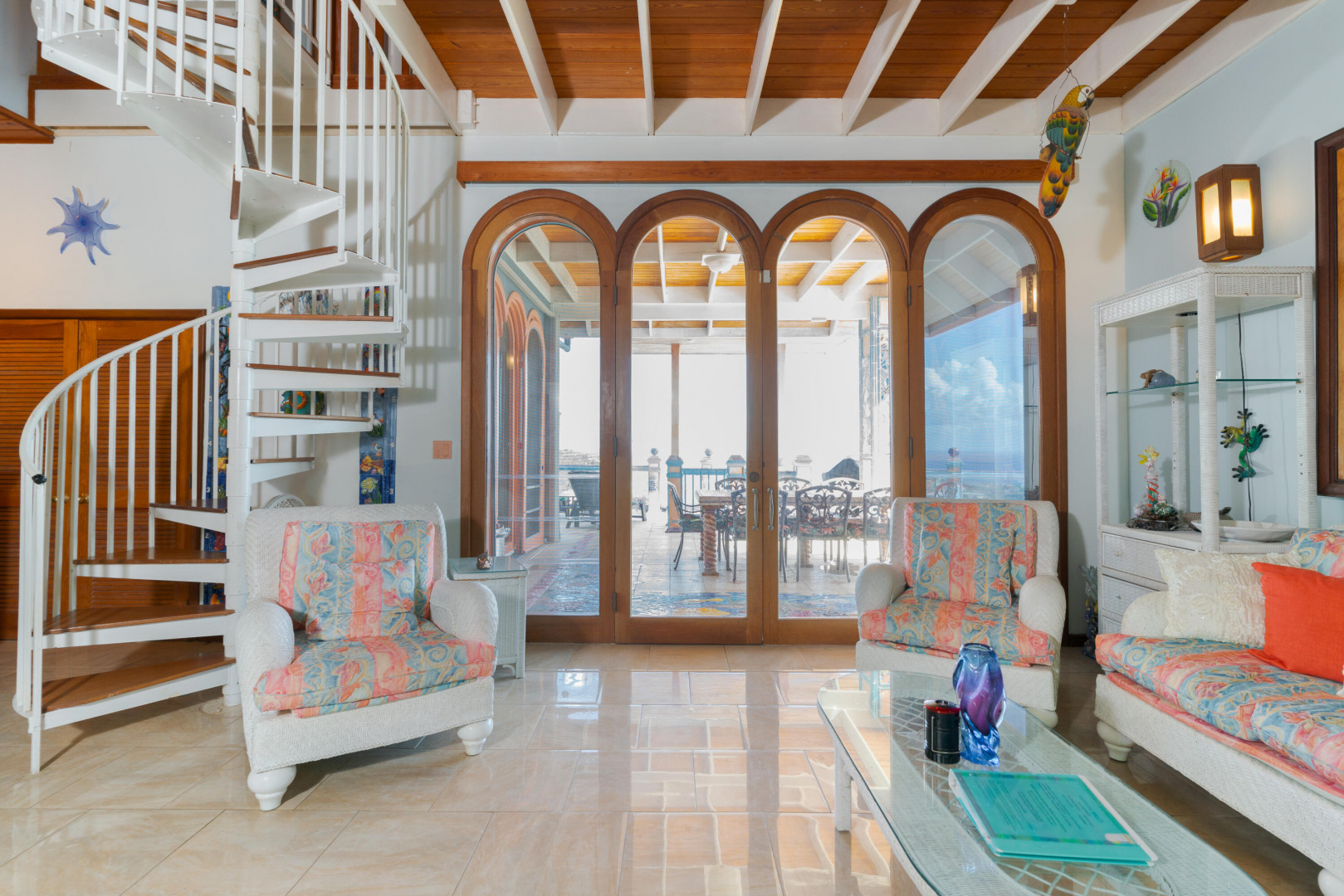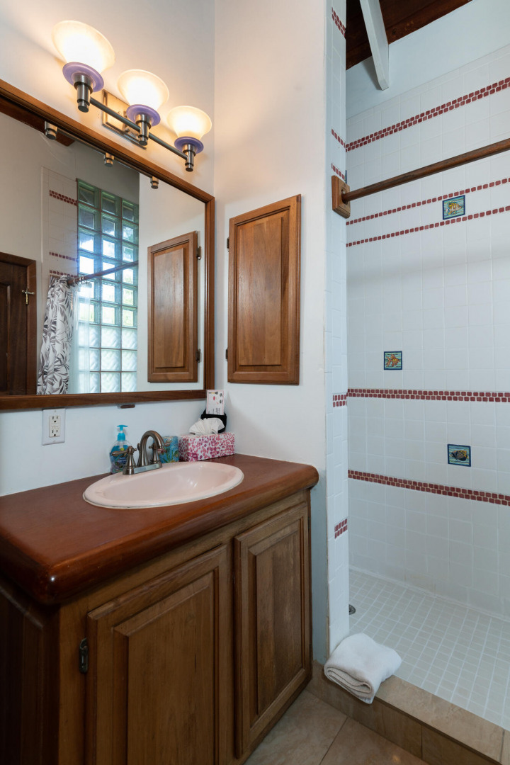 Sapphire Breeze is a 4 bedroom private villa with a pool, hot tub, and majestic views. This joyful villa is accented with Caribbean colors and custom ceramic artwork both inside and out. The two-level design of this spacious home offers plenty of room to gather, yet it also includes private areas for you to relax and enjoy some alone time. The main living area is an open floor plan, with adjoining custom designed mahogany kitchen, living and dining areas and master bedroom suites on either side. Arched 9ft high mahogany and glass French doors open to the pool deck which includes a covered gazebo with an 8 person dining table, a pool with an 8ft waterfall and a 4 person hot tub! -