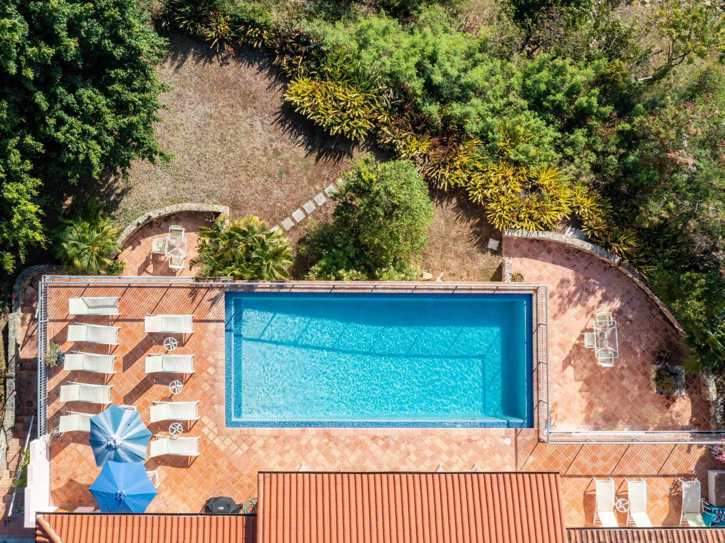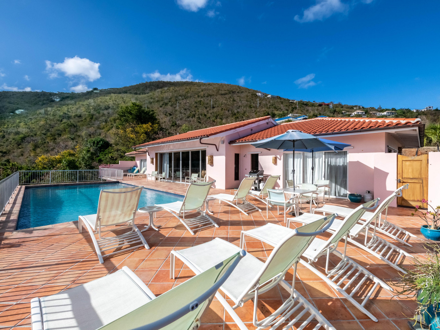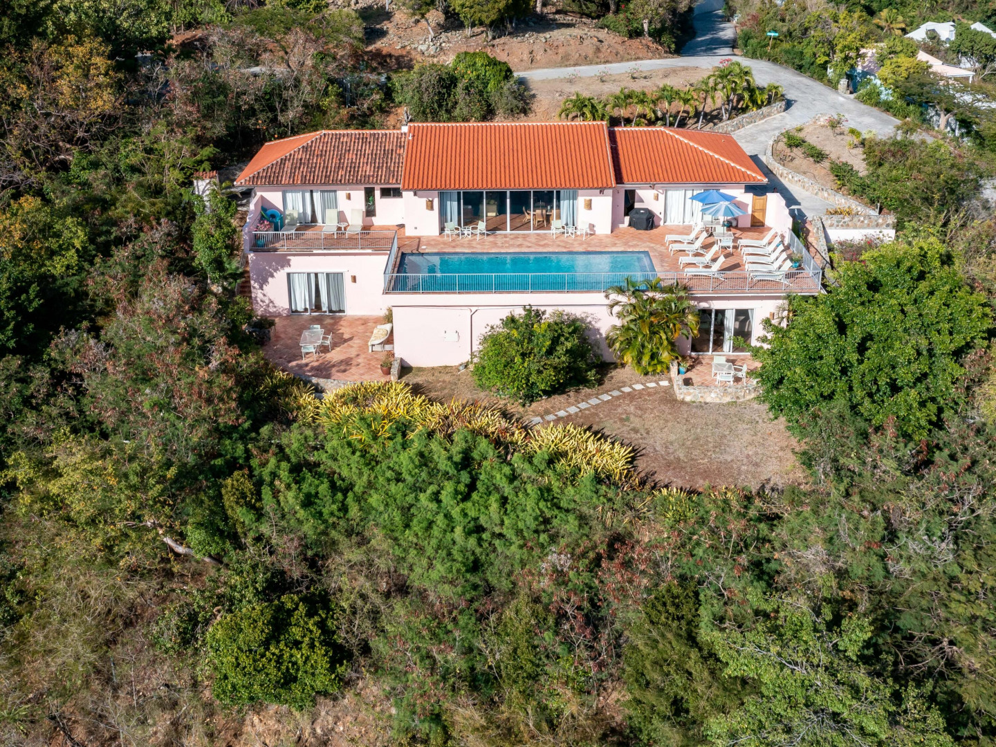 PRICE REDUCED! Villa Rendezvous is an elegantly decorated waterfront island home in prestigious lower Klein Bay. Enjoy captivating 180 degree views of Rendezvous Bay out to the Caribbean Sea. The 40 ft. concrete pool, surrounded by an expansive tiled deck, is one of the largest villa pools on St. John. With four very large en suites, each with king bed, accommodating up to 12 guests. Bedrooms overlook Rendezvous Bay with walk out sliders opening to the tiled decks. All bedrooms are also accessible from within the house. The villa is a very popular vacation rental with superior rental income. The level usable back yard with a full lawn and lush landscaping is perfect for events. Deeded beach rights to the HOA parcel 15A-7-27, a short walk up the road. Website included. -