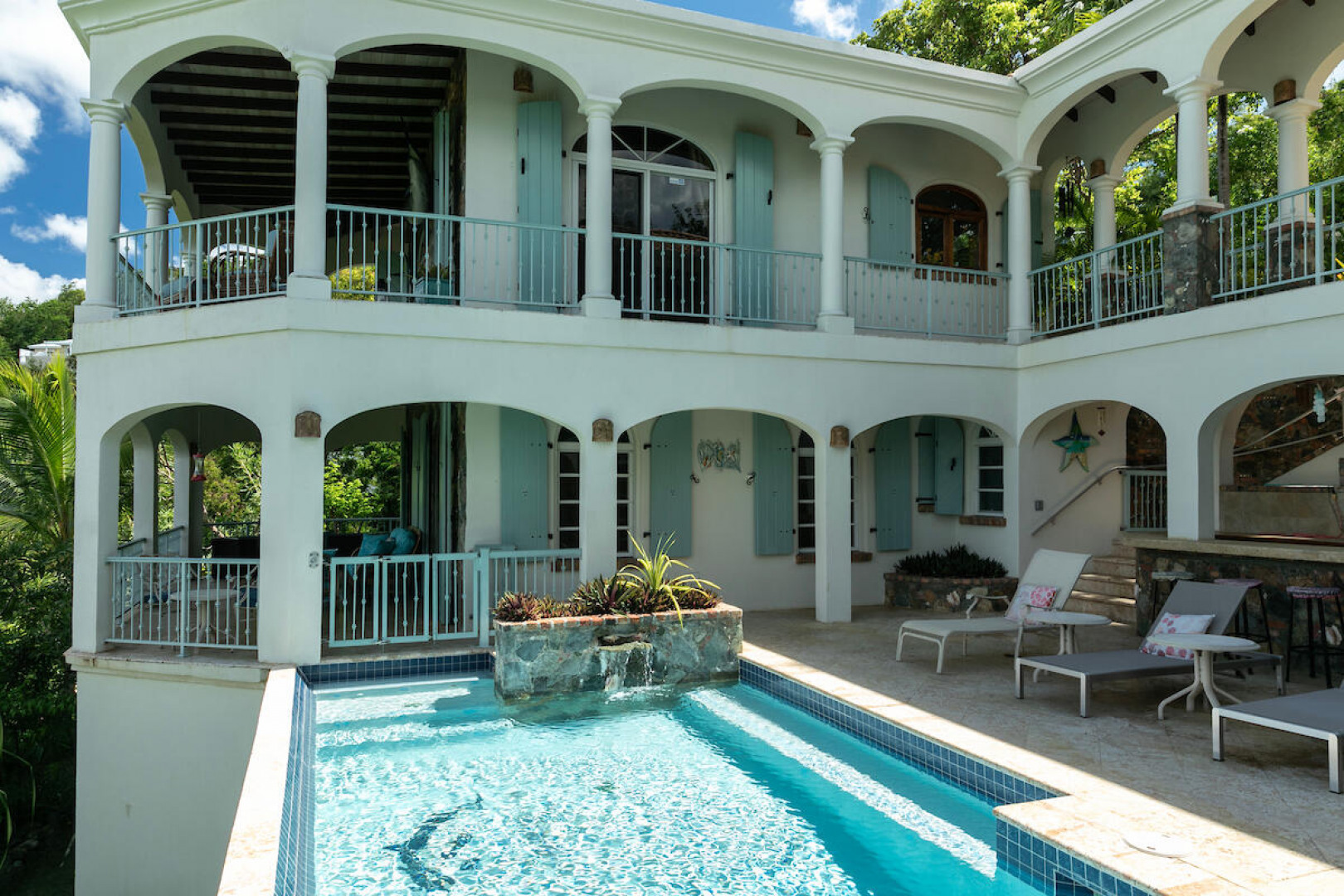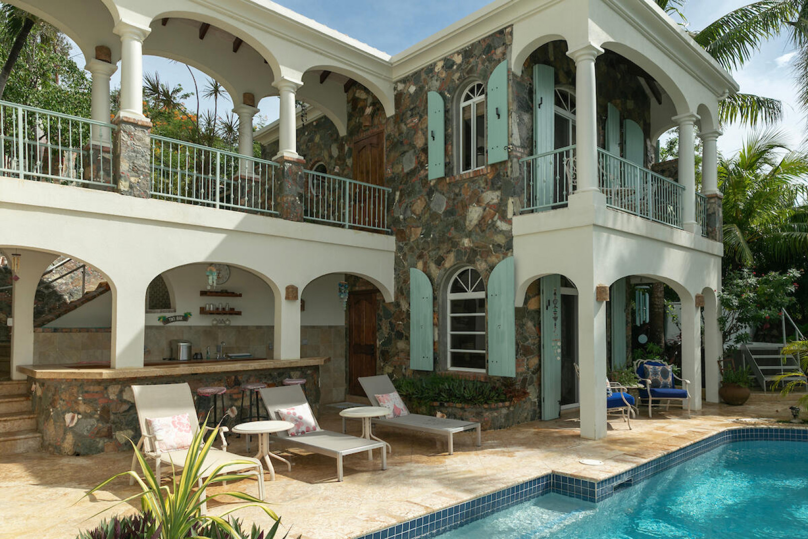 Villa Romance is an elegant, custom built, stone & masonry home with lush tropical landscaping situated on a spacious .50 acre parcel in popular Estate Chocolate Hole, only minutes to restaurants, shops and north shore beaches. This tastefully furnished villa consists of 4 bdrms with en-suite baths, gourmet kitchen, spacious great room and a relaxing pool & entertainment area with stunning harbor and ocean views. Truly a ''must see'' to appreciate the attention to details. Previously used as a private family retreat, this villa is new to the short term rental market. Buyer shall honor future bookings. Buyer & Seller shall equally split the costs of the transfer tax. Buyer to confirm square footage, cistern capacity and all information. -