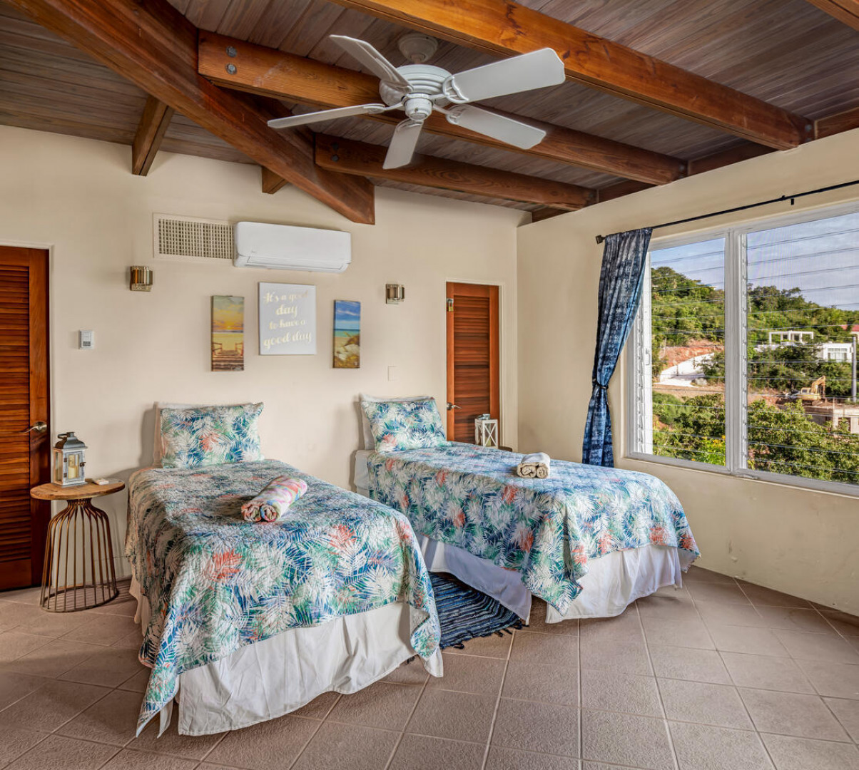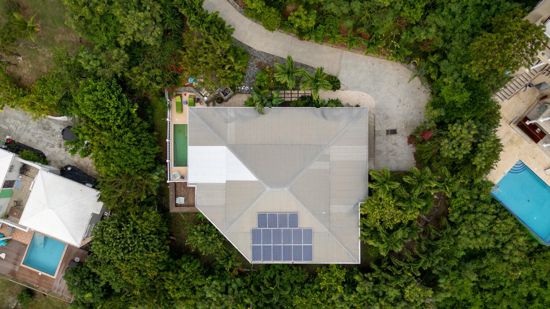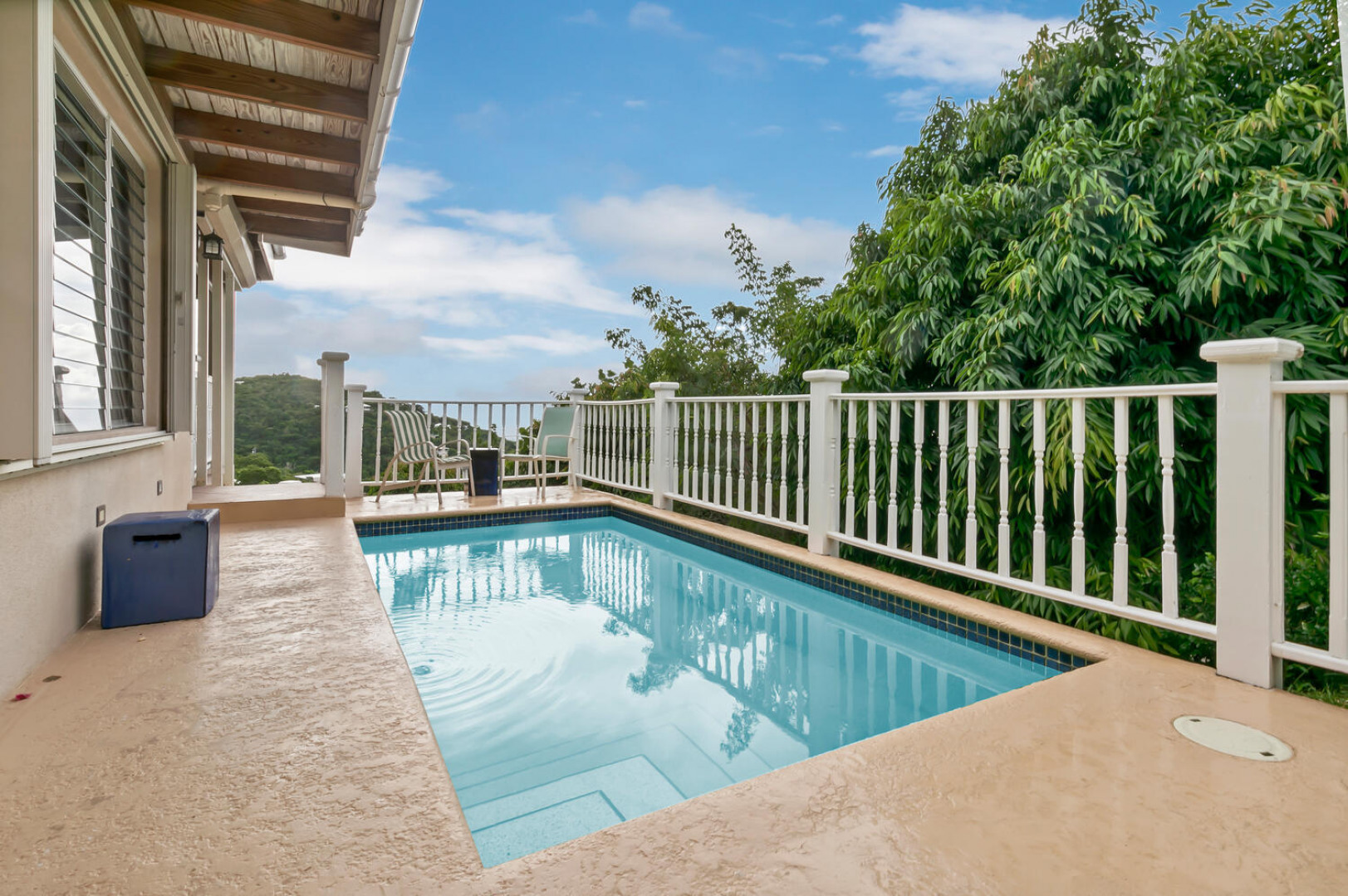 Harts Delight is a stunning villa with numerous amenities and a serene setting on the South Shore of St. John. A spacious, open upper level features high vaulted ceilings in the spacious great room which opens onto a large screened-in porch area, and a deck with captivating views of Hart Bay. Two air-conditioned bedrooms, each offering privacy are situated on opposite sides of the great room.The pool area is ideal for lounging and adjoins a lower level porch for dining and relaxation. On the lower level with its own private entrance is a one bedroom apartment for added flexibility as income producing rental, caretakers unit or guest quarters. -