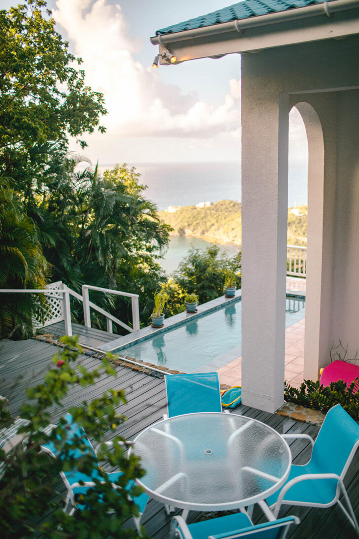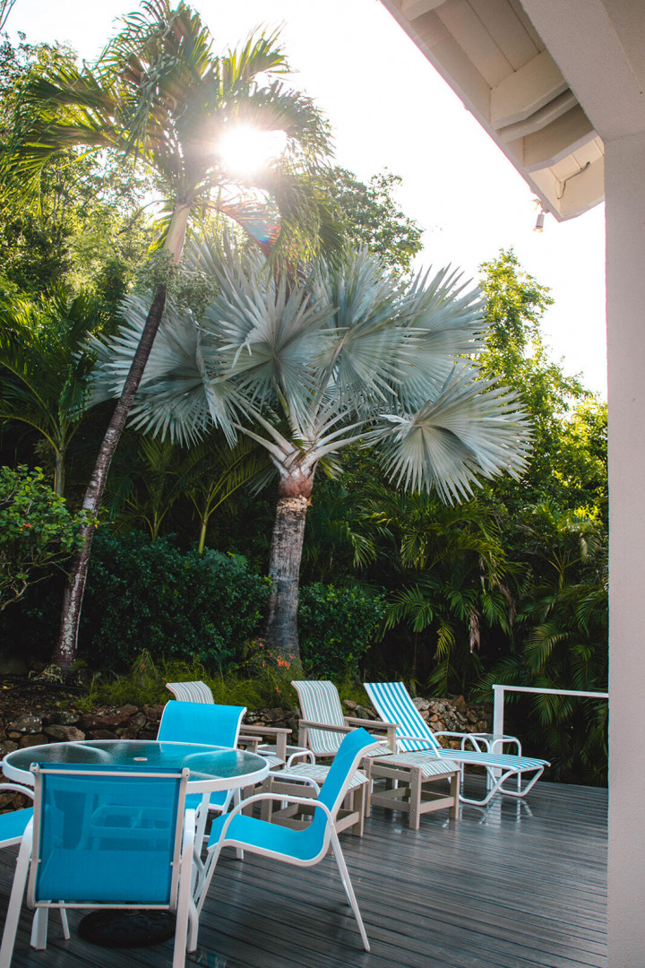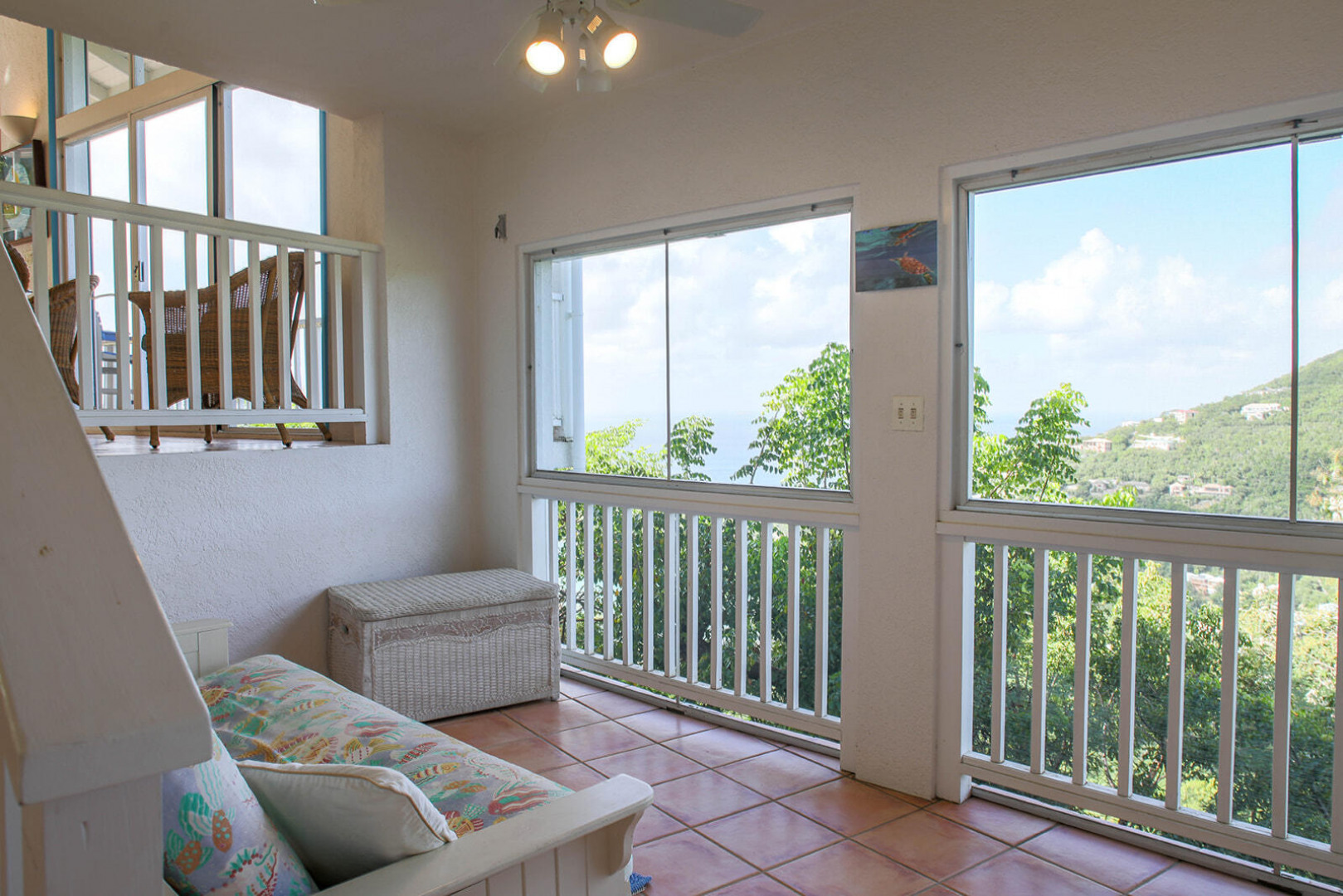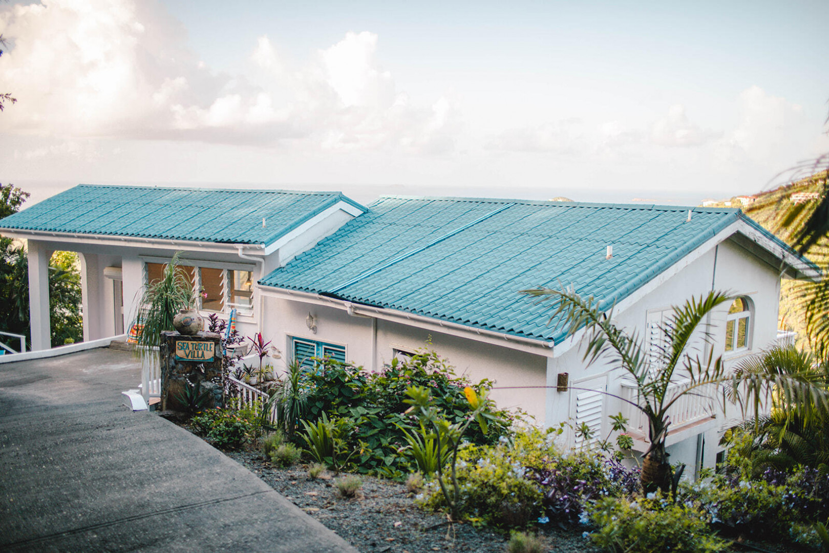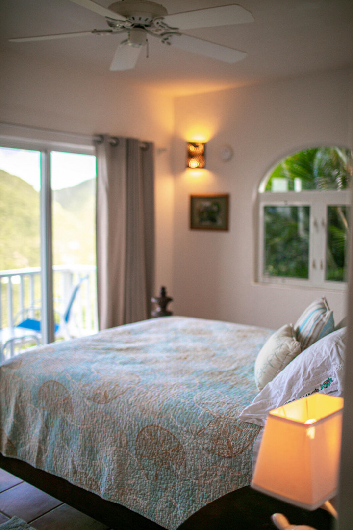 Sea Turtle Villa is a lush tropical escape perched on a hill in Fish Bay. Water views from every angle This gorgeous Virgin Islands Style home features Solar Net Metering, successful rental history, vaulted ceilings, large living area, and the perfect private location at the end of the road in Fish Bay. The home features 2 bedrooms, 3 bathrooms and 2 extra bonus areas that can be used as sleeping alcoves, converted to game areas, or more, the ideas are endless! The landscaping features a professional touch with towering palms, and gorgeous flowers lending to the special property that is Sea turtle Villa. Buyer to honor all confirmed rental reservations. -