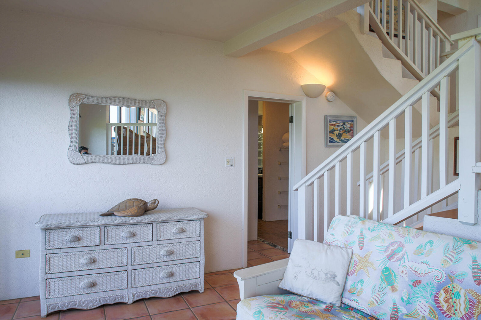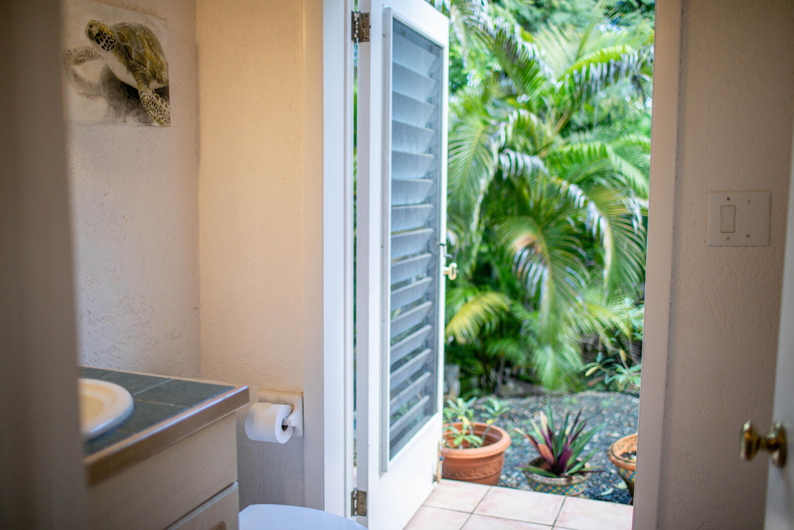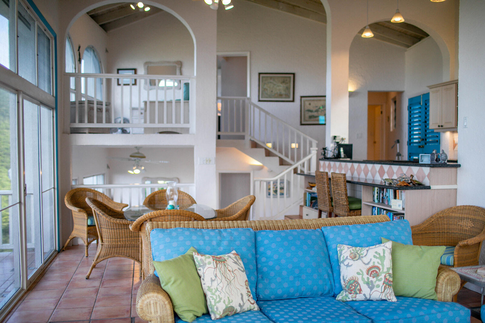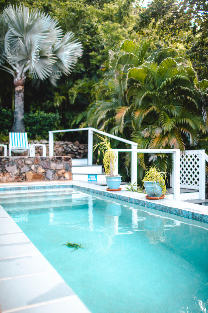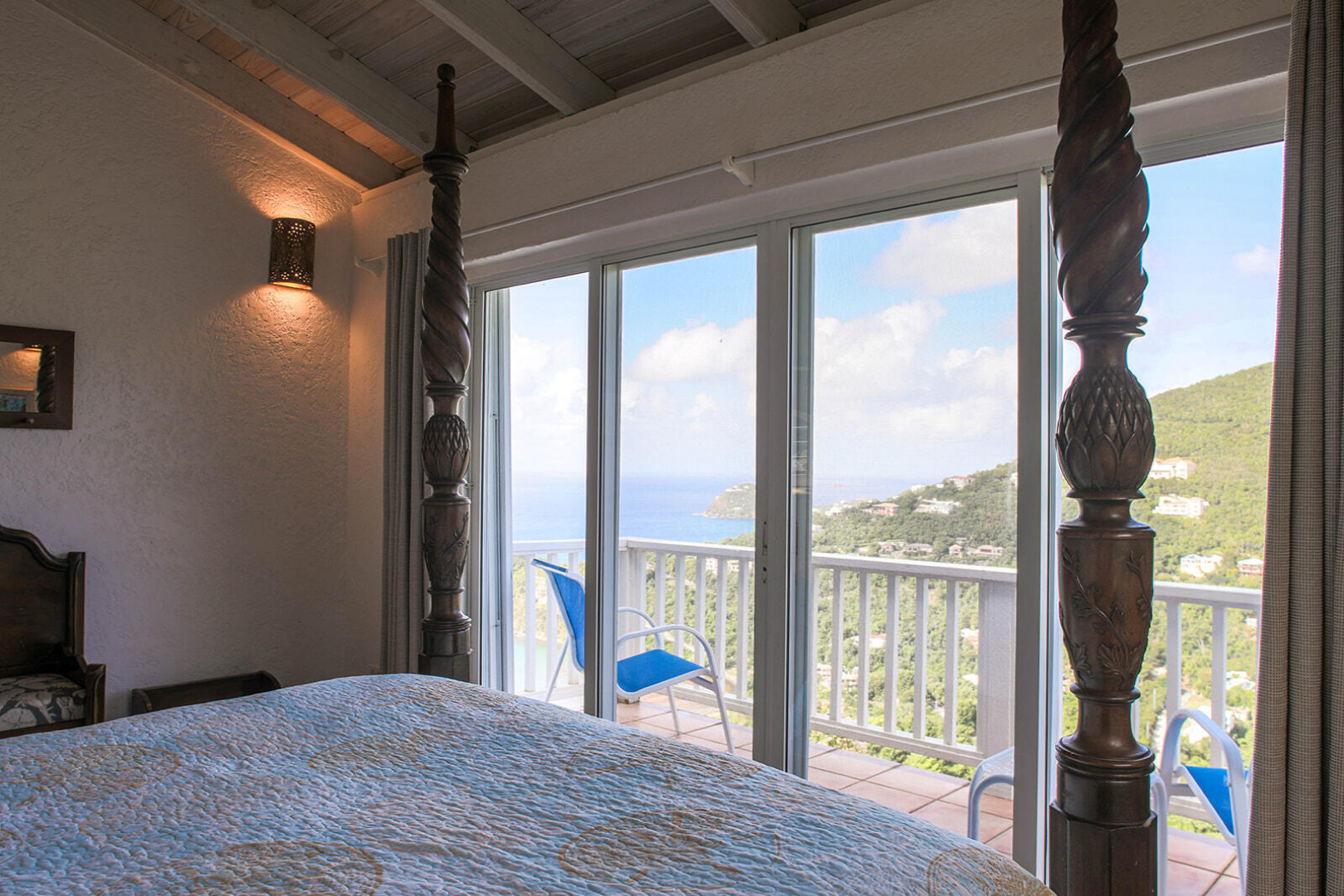 Sea Turtle Villa is a lush tropical escape perched on a hill in Fish Bay. Water views from every angle This gorgeous Virgin Islands Style home features Solar Net Metering, successful rental history, vaulted ceilings, large living area, and the perfect private location at the end of the road in Fish Bay. The home features 2 bedrooms, 3 bathrooms and 2 extra bonus areas that can be used as sleeping alcoves, converted to game areas, or more, the ideas are endless! The landscaping features a professional touch with towering palms, and gorgeous flowers lending to the special property that is Sea turtle Villa. Buyer to honor all confirmed rental reservations. -