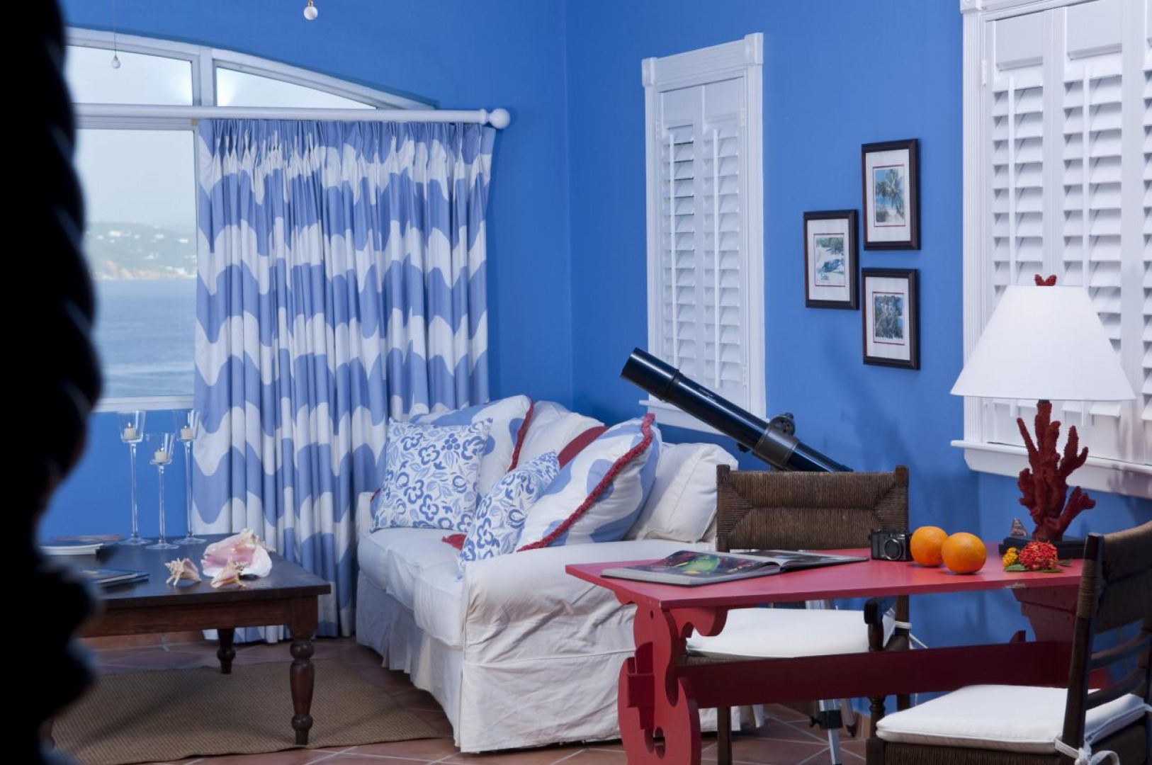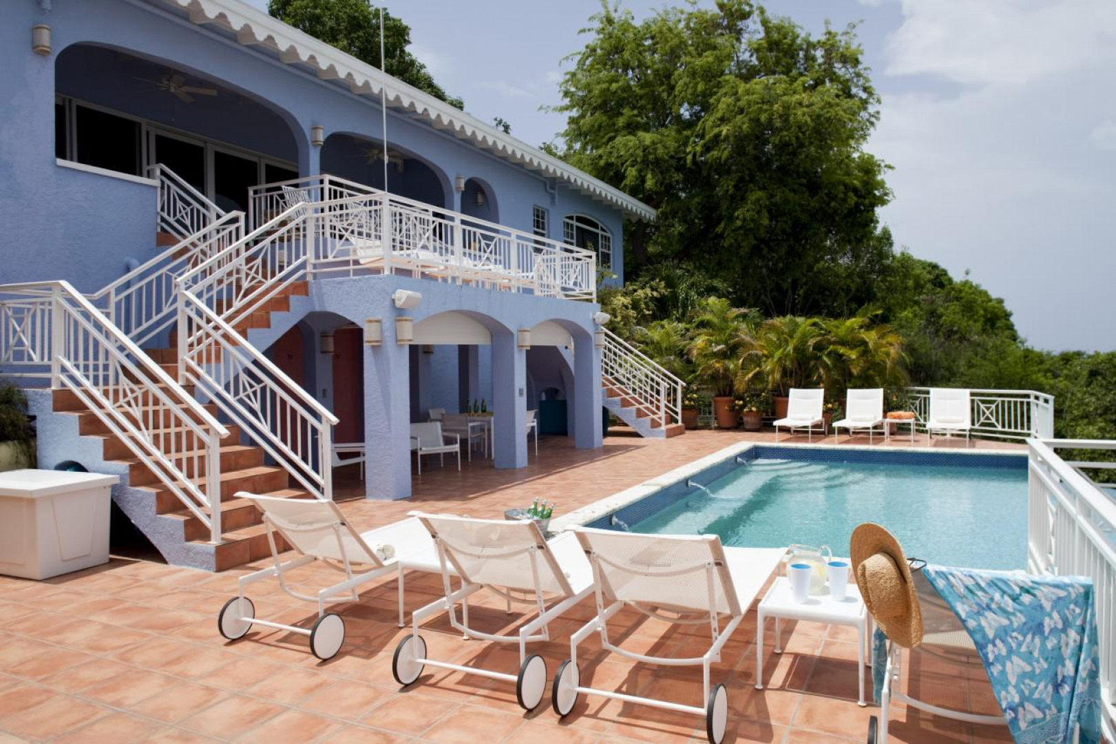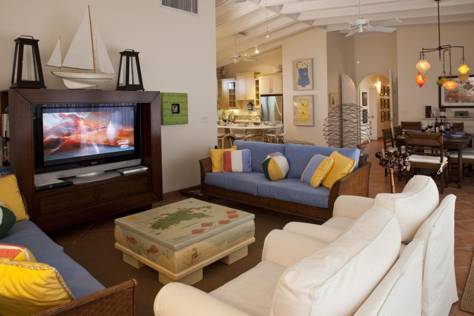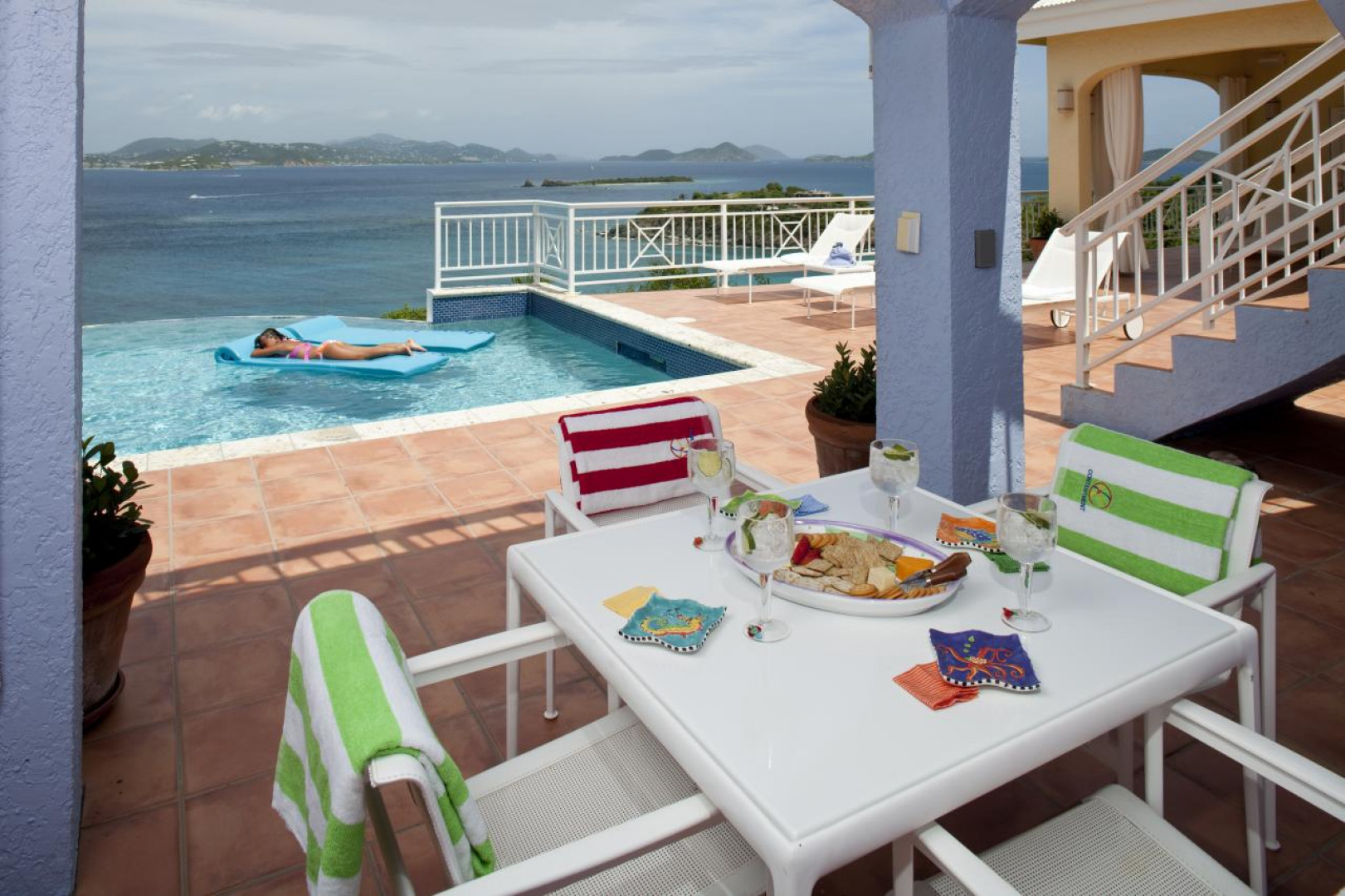 CONTENTMENT is a magnificient villa overlooking the azure waters of Pillsbury Sound to St. Thomas. Located close to Cruz Bay in the private Waterklip neighborhood, CONTENTMENT includes designer finishes and furnishings and was completely renovated and expanded in 2005. Colorful artwork, walls and fabrics enhance the feeling of being in paradise in each of the 6 bedrooms and 6.5 bathrooms. The main level features spectacular views, a chef's kitchen and large Great Room along with 3 spacious bedrooms and 3.5 baths and a lovely covered porch to take in the sunsets and sailboats on the Sound. The lower level offers an infinity-edge pool with large deck area, and the separate Cabana House has 2 bedrooms and adjoining baths along with a massage area. There is a bunk bed room forthe kids!