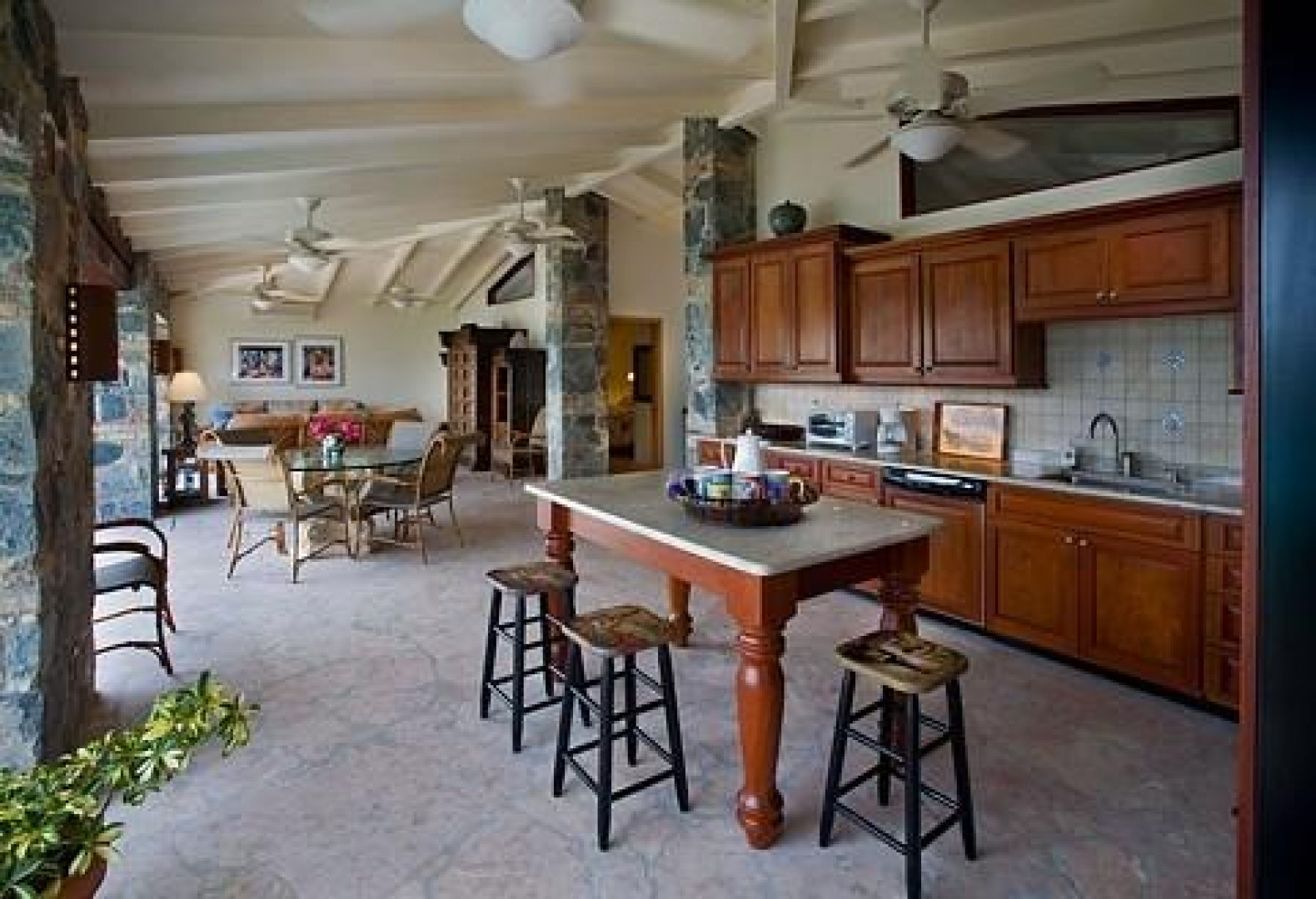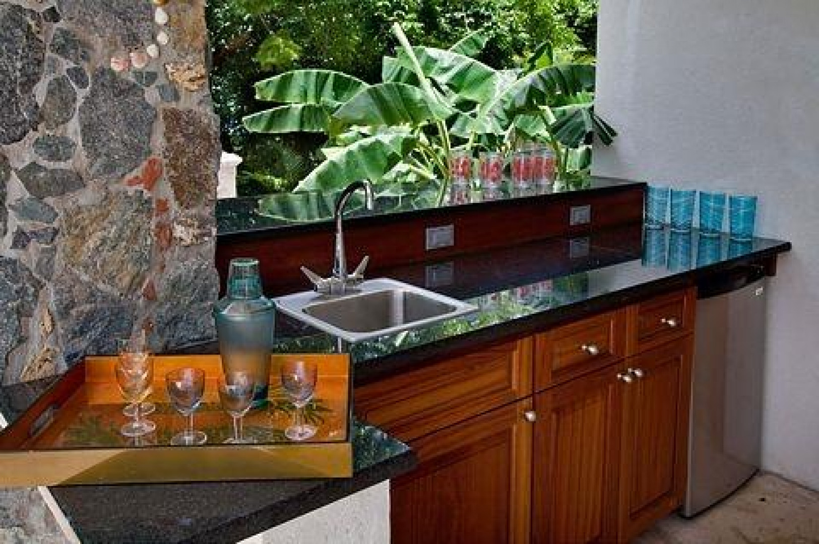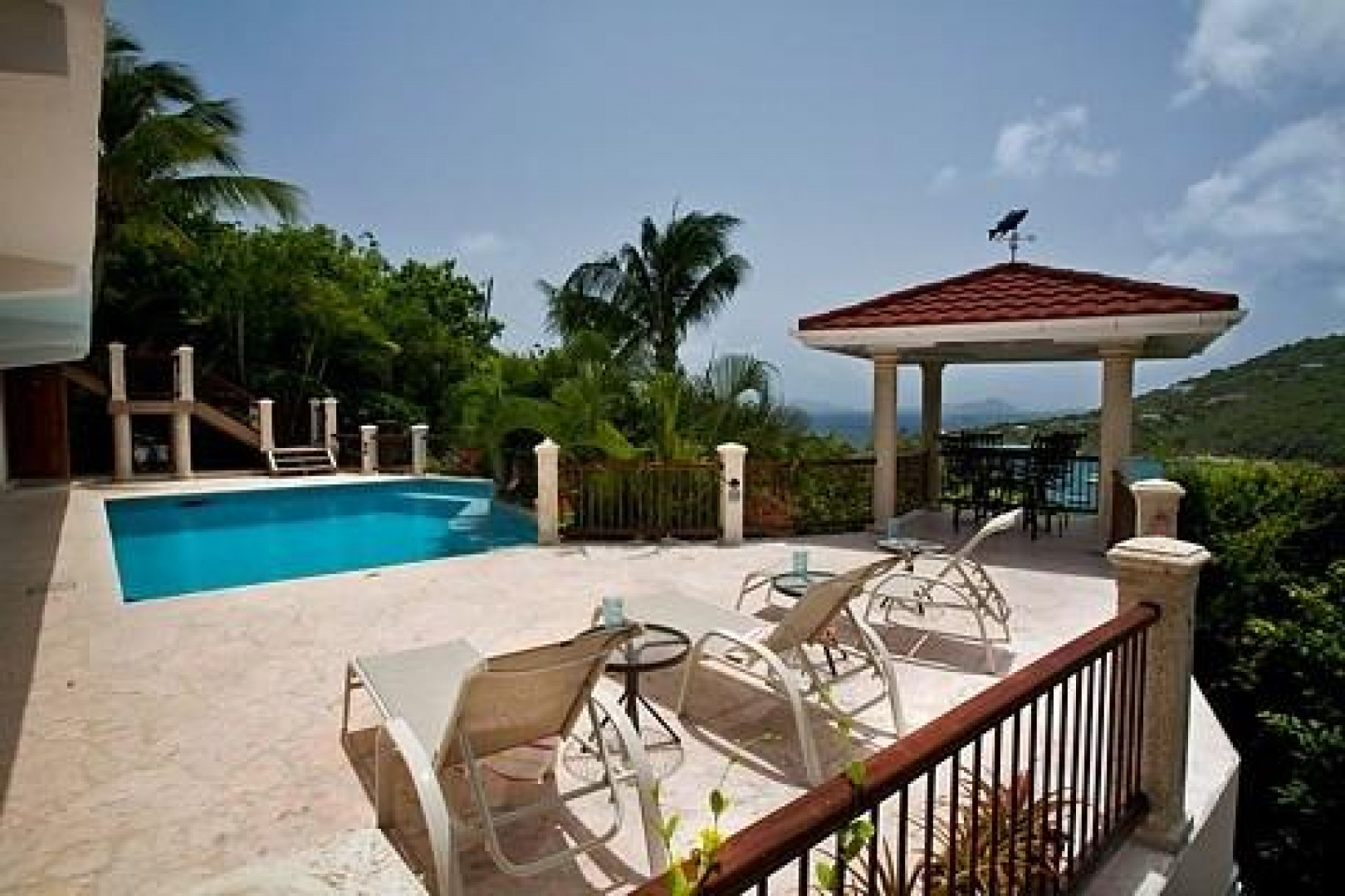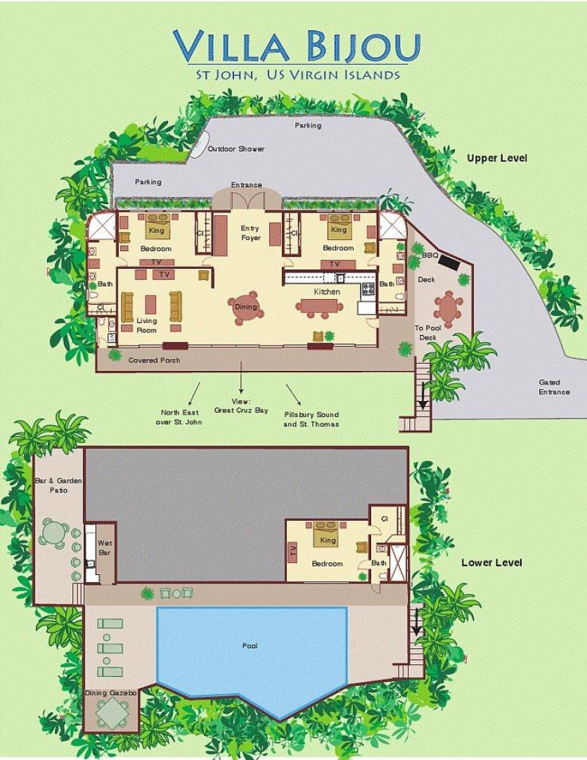 Villa Bijou is a fully furnished three-bedroom, three and one-half bath pool villa with gated entry. This lovely air conditioned Great Cruz Bay residence was completely remodeled and modernized in 2006 with high end finishes; custom mahogany doors and windows, stone showers, large closets with owner's lockouts, and lovely freeform coral stone floor coverings. Outdoors, you'll find over 1,600 square feet of beautifully tiled porches and patios for dining, sunning or sipping cocktails around the pool bar and gazebo.To ensure year-round comfort the pool is heated and cooled by heat pump and energy concerns have been fully addressed with a solar panel net metering system that provides huge savings on utility bills. There is even a diesel backup generator in the event of loss of power. All glass openings are fitted with hurricane screening, a compact, lightweight and aesthetically attractive alternative to other types of protective storm measures. This property is a very popular vacation rental due to the convenient Great Cruz Bay location which provides for stunning sunset views overlooking the bay and St. Thomas in the distance.