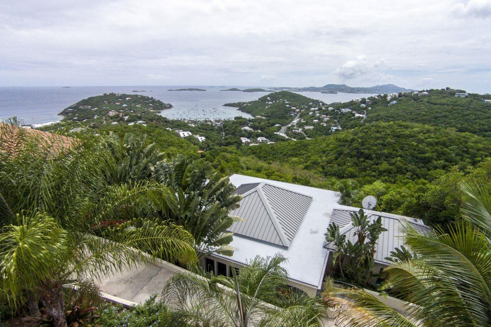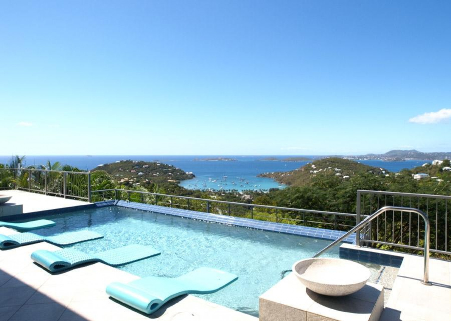 INFINITY is a spectacular villa with a unique blend of West Indian and contemporary architecture designed by local architect, Rob Crane. Situated in the gated community of Virgin Grand Estates, this luxurious home features breathtaking views of St. Thomas and the surrounding islands. The gourmet kitchen offers custom mahogany cabinets, beautiful Silestone counter tops and KitchenAid appliances. Other amenities include exquisite Italian tile floors, stylish furnishings, custom mahogany and glass doors, Fleetwood sliding doors, designer lighting and hardware, and two tasteful one-half baths. All four spacious air-conditioned bedroom suites are accessible from the inside. This successful rental villa offers views from every room as well as colorful sunsets from the inviting 24 ft. pool.