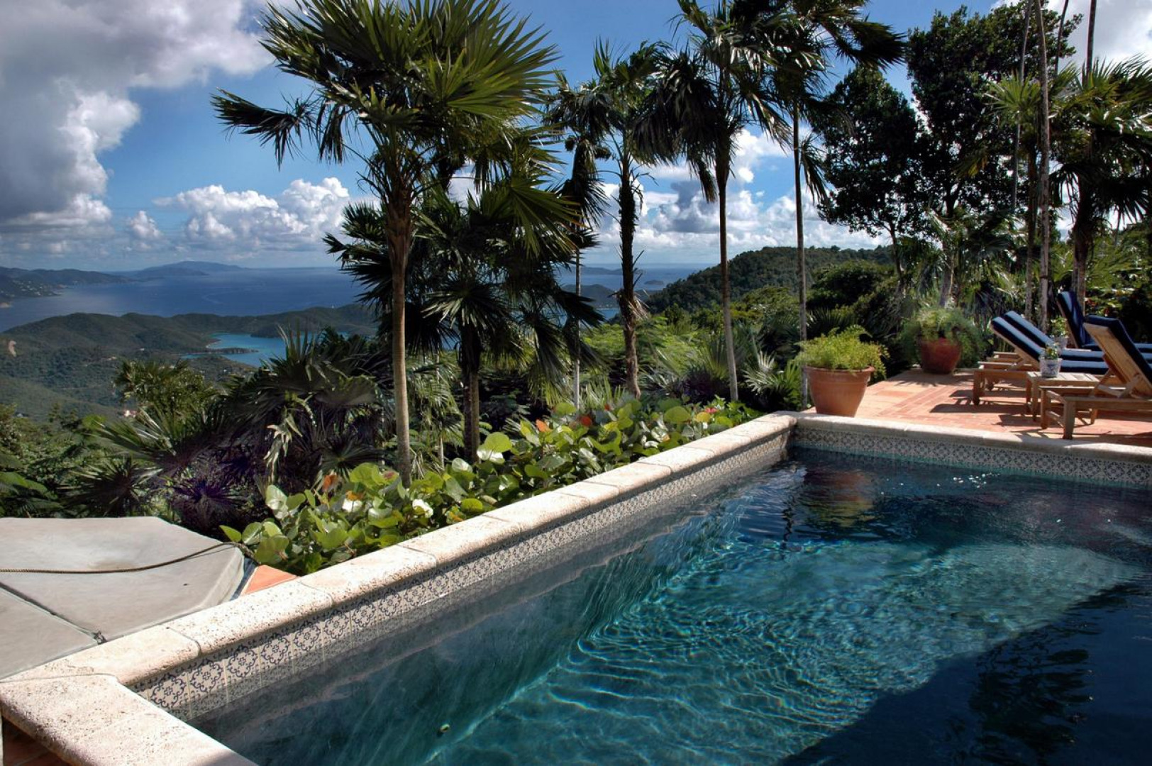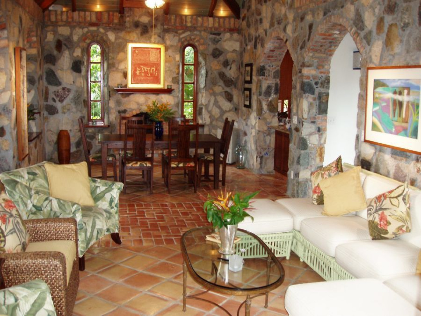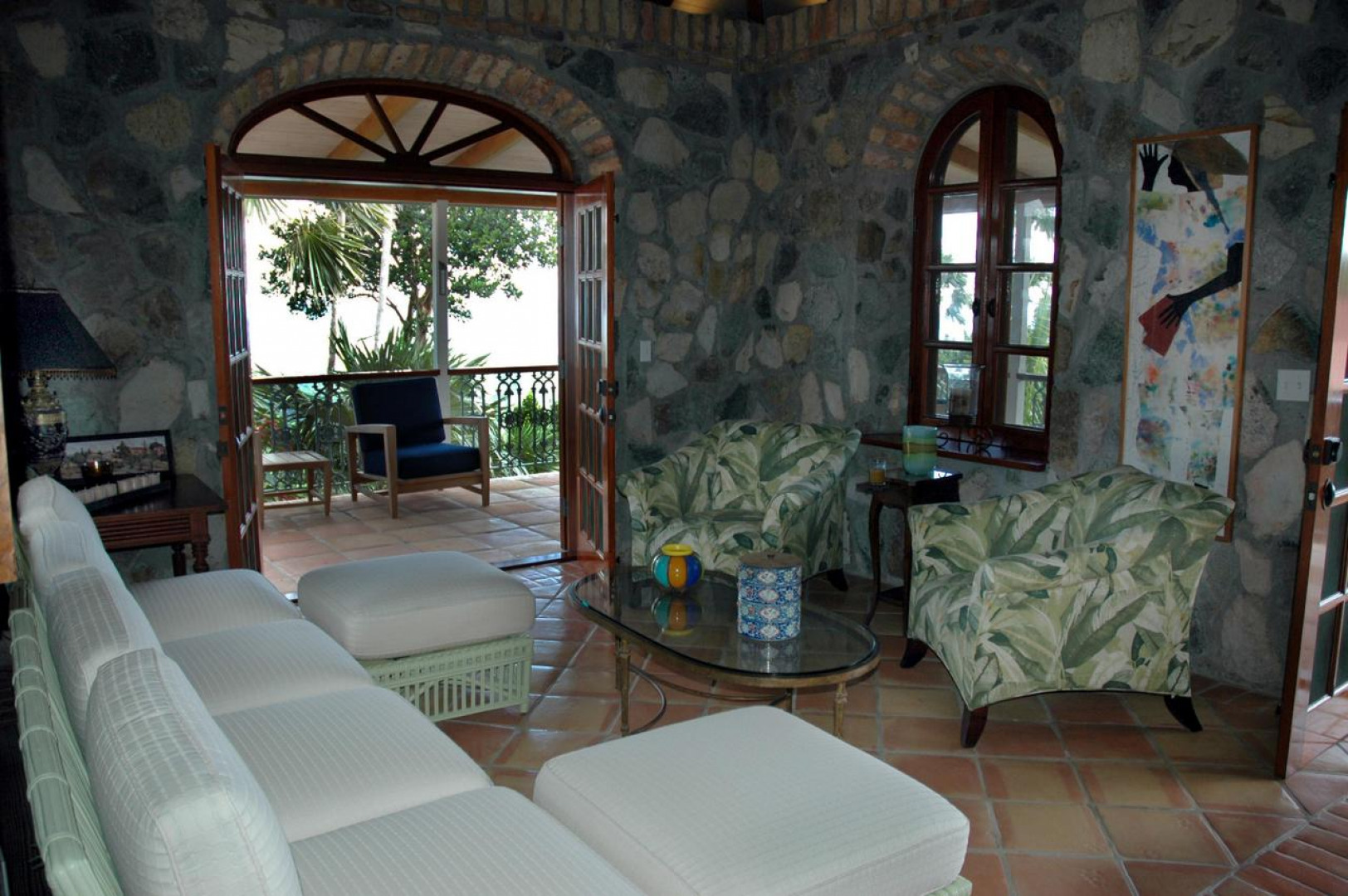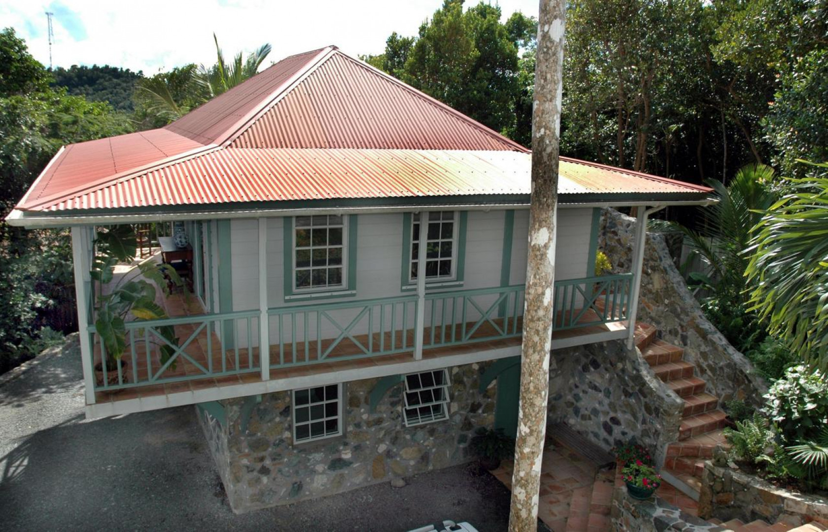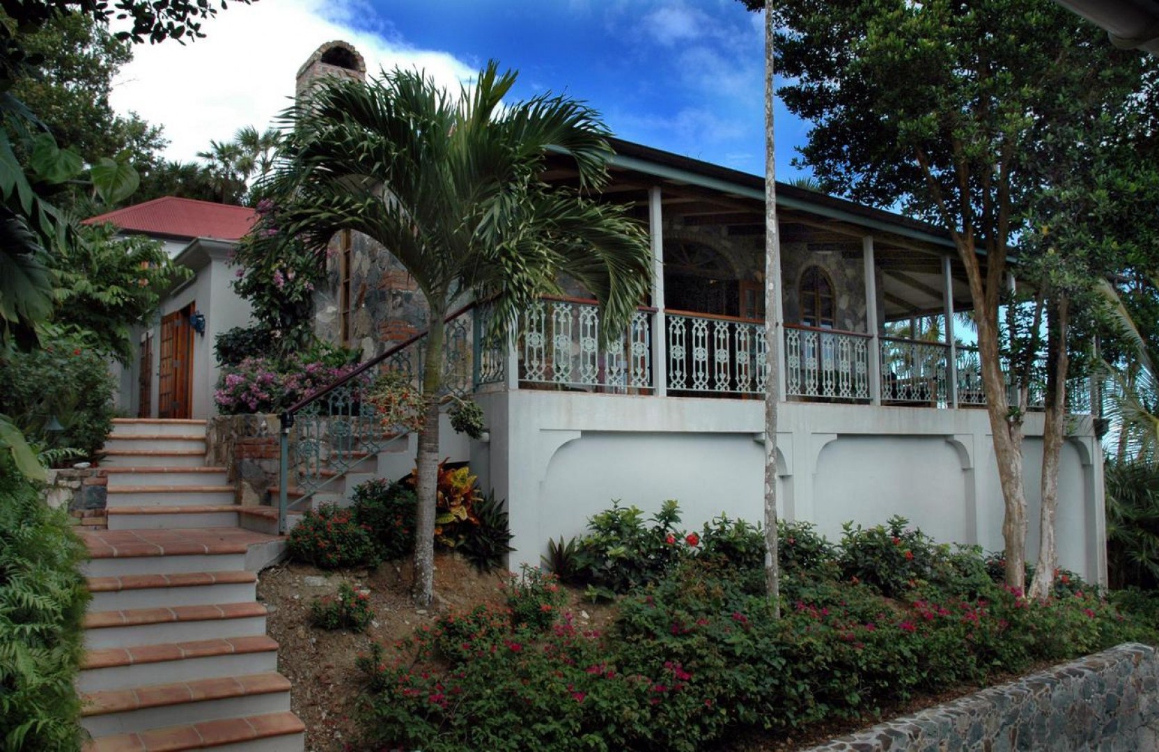 Bordeaux Mountain House enjoys a spectacular mountain top location with cooling breezes, exceptional views, privacy and tranquility, yet this custom designed villa is only a short ride from Cruz Bay, Coral Bay and the north shore National Park Beaches. This gated estate residence features an elegant stone and masonry main house plus a large guest house all in a lush tropical setting with abundant indoor and outdoor living space, an in-ground pool and oversize spa all on level terrain with easy access and ample parking. See SUPPLEMENT and DOCUMENTS for more details.NOTE: THIS SUPPLEMENT ALSO AVAILABLE AS PDF DOCUMENT SUITABLE FOR PRINTING. CLICK ON DOCUMENTS LINK TO VIEW. Bordeaux Mountain House: 10-8-4 Carolina Additional features, benefits and amenities... Custom designed by the builder as his family's private, gated compound - this home has a warmth and appeal that sets it apart from the typical vacation villa. Wooded site, gentle terrain, offers tranquility and privacy with expansive views of Coral Bay, the east end of St. John, the Sir Francis Drake Channel and many of the British Virgin Islands, all from an elevation of nearly 1000 ft. Conveniently located in the center of the island, about 15 minutes from Cruz Bay, 10 minutes to Coral Bay and about a 10-15 minute drive to the National park beaches on the north shore. Beautiful hand crafted native stone work, accented with Chicago brick, is used tastefully throughout much of the main house and for the lower level of the guest cottage. Gourmet kitchen with Viking gas stove, polished granite counter-tops, stainless steel appliances, custom cabinets, microwave, built-in wine cooler. Second great room with dining and living areas on the lower level adjacent to the pool deck. Custom mahogany doors, windows and cabinetry throughout the main house. Stone hearth in the upper great room is a fully functional fireplace for cool winter evenings. Wraparound covered verandahs with decorative wrought iron railings. All rooms in the main house, guesthouse, pool, sundeck and outside areas are wired for sound (Bose speakers). AM/FM, satellite radio, 6-disc CD player and Ipod connection available. Heated pool and spa with expansive tile deck cool to the touch and low maintenance. Fully equipped den/office/media room could be converted into another bedroom. Separate guest cottage with two bedrooms up and full bath; Lower level recreation room could become another full sized bedroom. Addition of full bath on existing slab is quite feasible. -