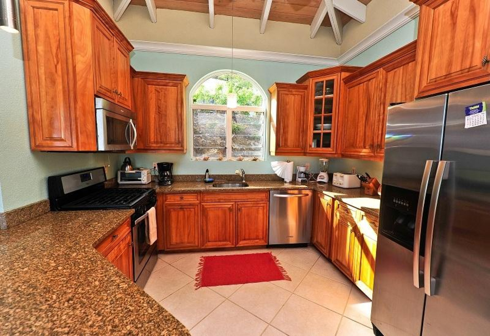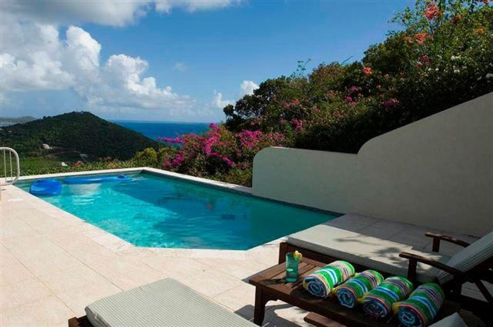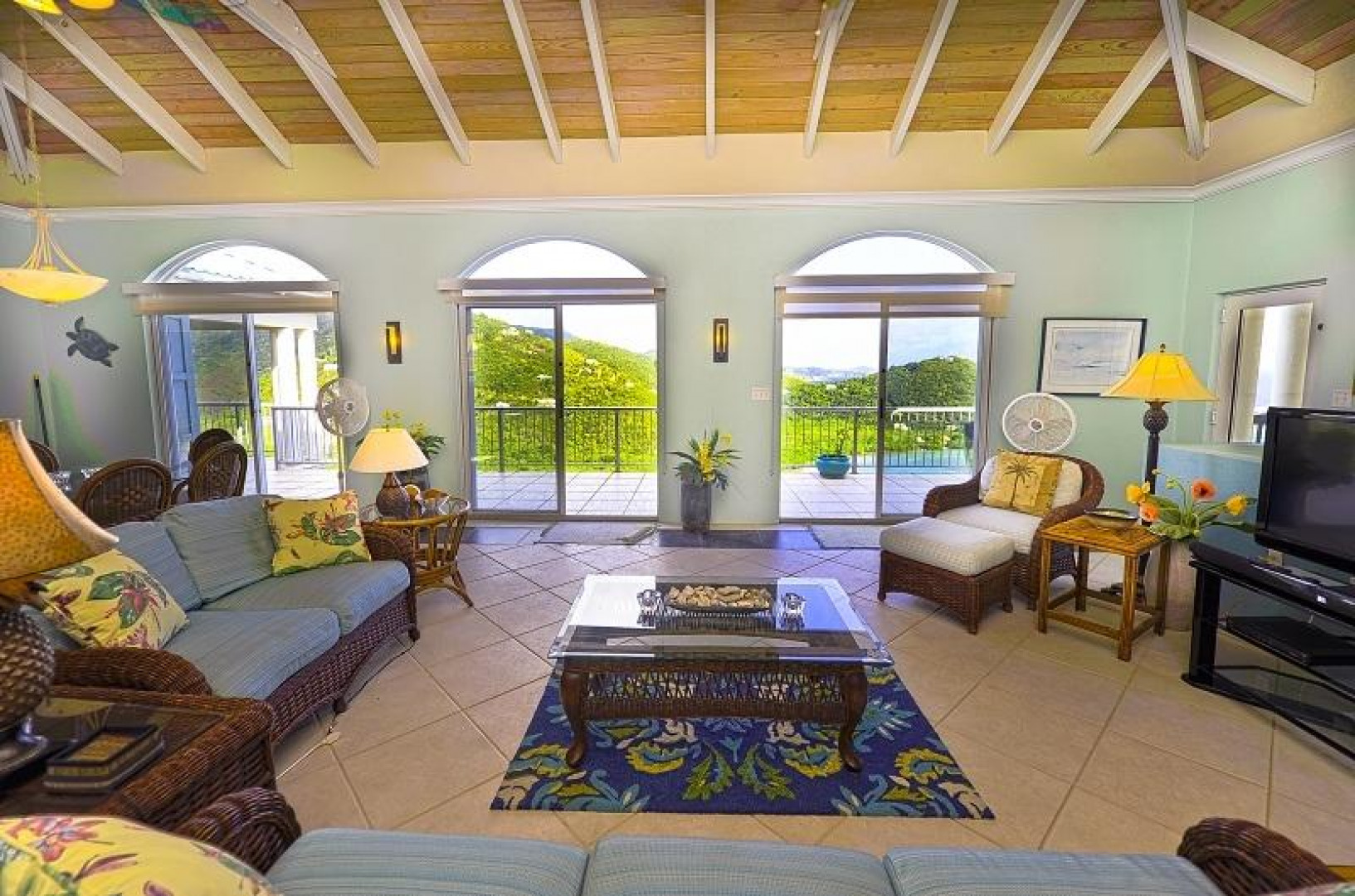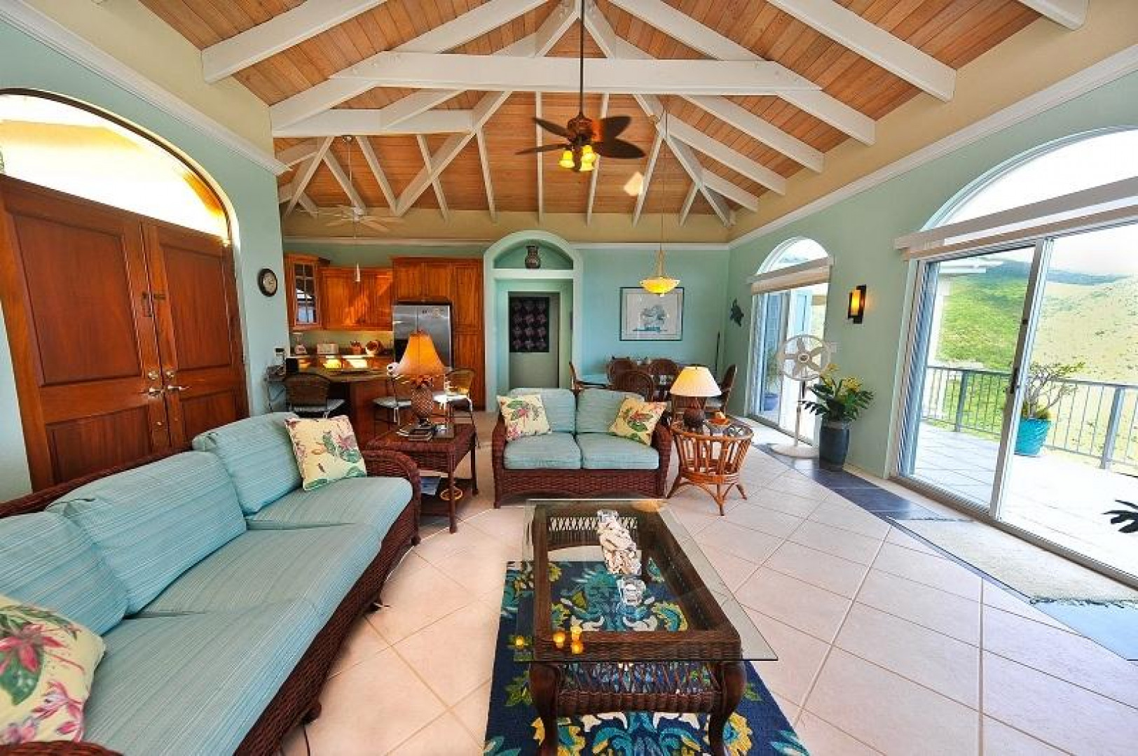 In the desirable upscale neighbrhood of Point Rendezvous, ''Villa Le Virage'' is a welcoming 4 bedroom, 4 bathroom, all masonry pool villa which offers excellent views east to Ram's Head, and south to St. Croix. This home sees incredible sunrises as well as moon rises! It features a generous light and airy open floor plan with expansive outdoor decks, beautiful island stonework, tasteful furnishings, tile floors and lushly landscaped grounds. Two bedrooms are on the upper level and two more are downstairs using an interior staircase! Perfect for families with children or multiple couples vacationing together.