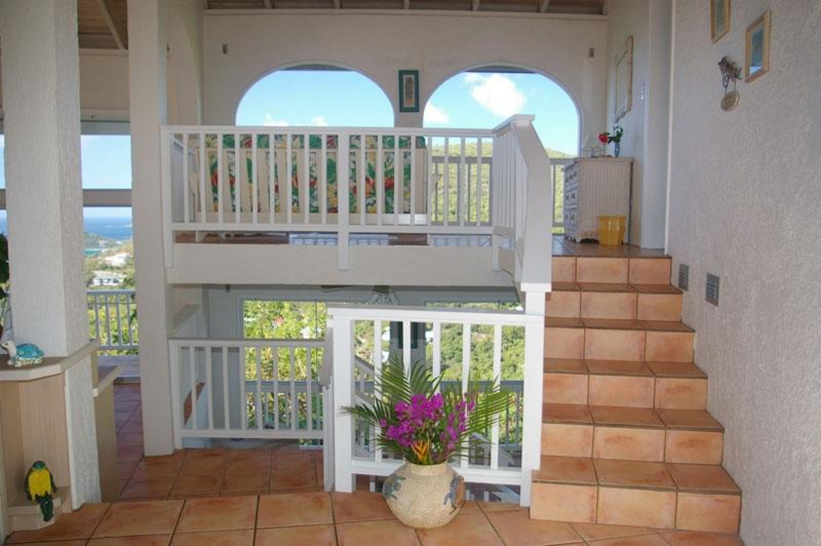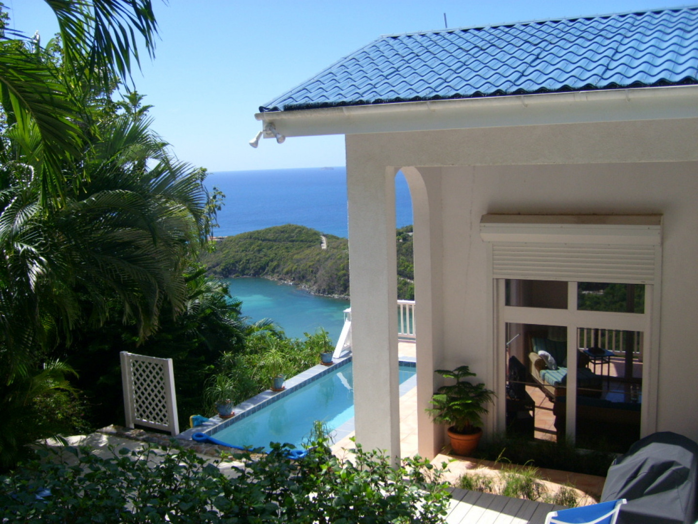 SAVE WAPA COSTS! "SEA TURTLE VILLA" is a "green" SOLAR NET-METERED contemporary home that cash flows! Impressive water views, 2 master suites plus 2 sleep alcoves, 3 baths, tropical landscaping, pool, & open architecture set amidst secluded privacy. Successful vacation villa or great island home! This beautifully appointed West Indian contemporary styled home in Skytop Estates above Fish Bay. It has been touted by guests as "The Perfect home on the perfect island--with majestic morning views, as well as spectacular sunsets over the hills". The stunning panoramic water vistas seen from every room are enhanced by vaulted ceilings, large interior arches and ten ft. exterior openings. They give this lovely home a truly tropical, open air atmosphere amidst secluded privacy.The pool and sundeck are situated just off the large great room. You’ll love the well equipped gourmet kitchen, the open loft and lower gallery area. The 2 master bedroom suites are furnished with traditional Virgin Islands style crafted from West Indian Mahogany and both have quiet split system A/Cs; 2 futons, and a third bath with island style outdoor shower, can provide additional guest accommodations. This custom built (all masonry) home is well protected, and the “alfresco� architectural design features coveted roll down hurricane shutters. The lush professional landscaping is beautiful, colorful and fruitful- with delicious limes and bananas ripe for picking! It is conveniently located just minutes from beaches for snorkeling or swimming, and just a short drive to town and restaurants. It provides excellent income as a rental villa, and is a charming island casual lifestyle home. Buyer to cooperate with documentation if Seller does a 1031 Tax Free Exchange. Buyer to split stamp tax equally with Seller. Buyer to honor all committed rentals, following date home goes under Contract. -