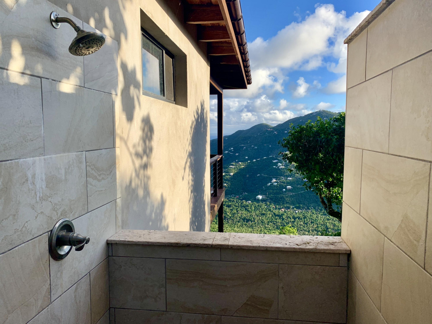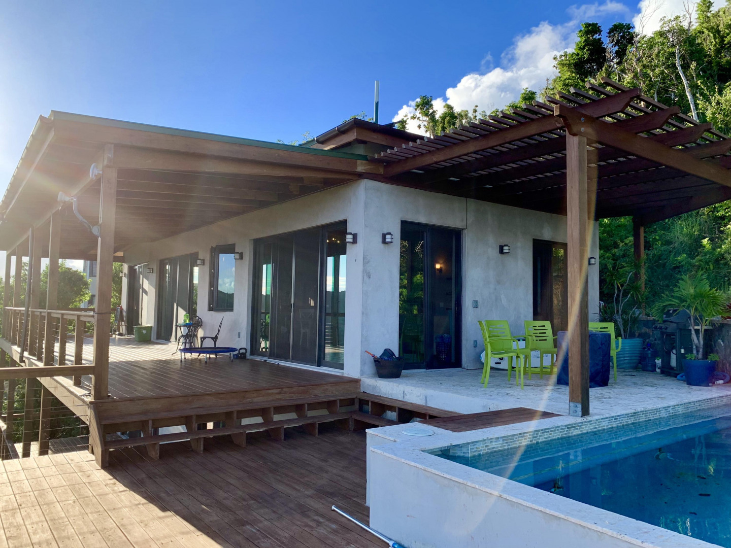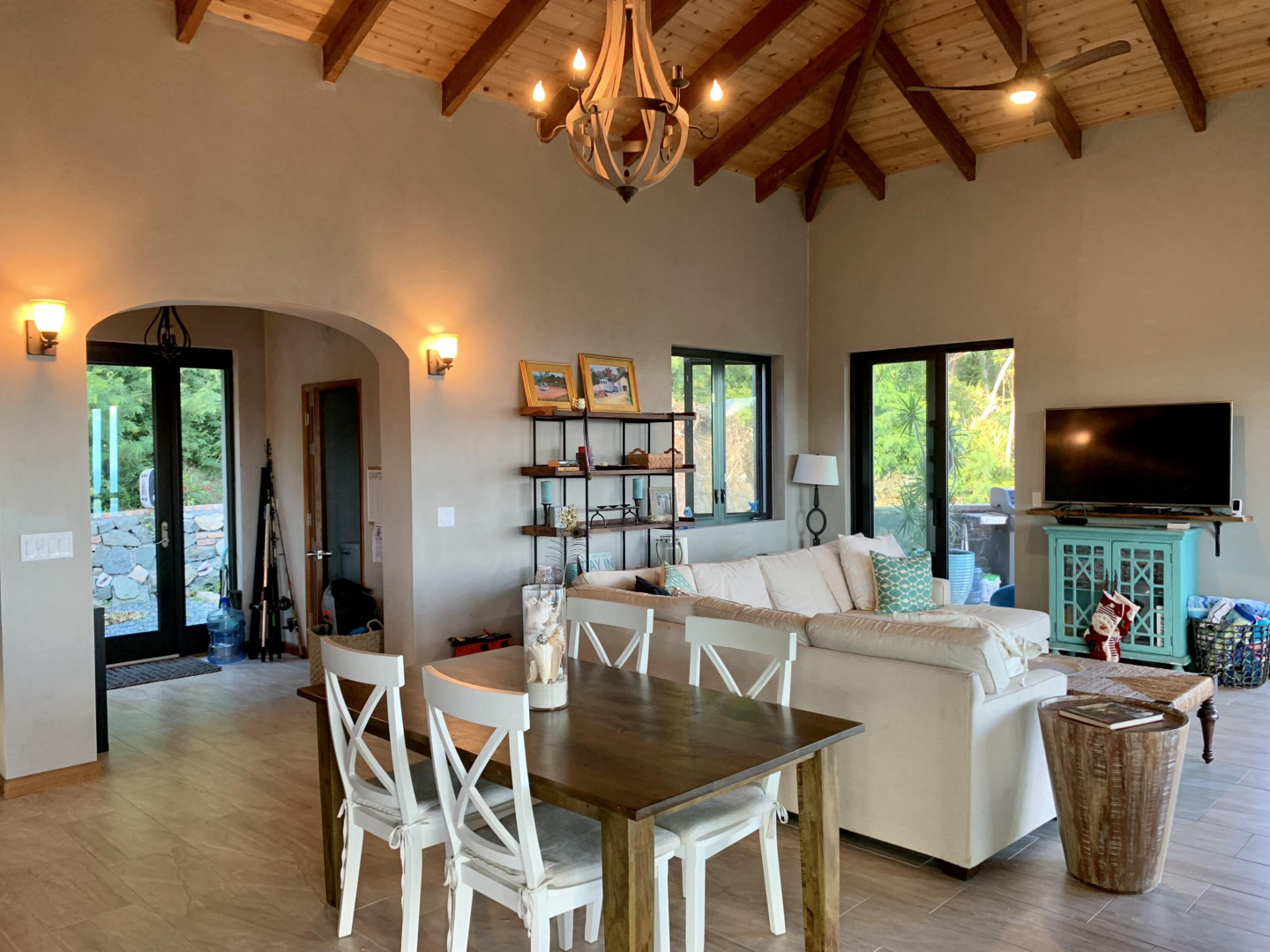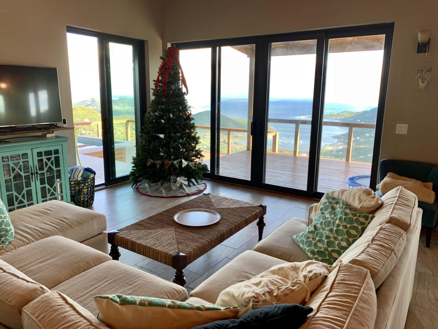 Villa Orenda - a concrete fortress sitting high on the hillside of coveted Ajax Peak with panoramic views that will take your breath away. Just minutes from the white sand North Shore beaches, this home is a true must-see, with solar panels powering 3/4 of the house. Orenda is an ideal layout for families, as all master suites are under one roof with interior access. A tasteful island stone entryway welcomes you to this newly constructed home with an incredible view from each of the hurricane rated windows and doors. Gaze down into Coral Bay harbor and beyond to the BVI, or across the lush valley views from 2 expansive decks featuring modern cable railings and a pool. Don't miss out on this opportunity! -