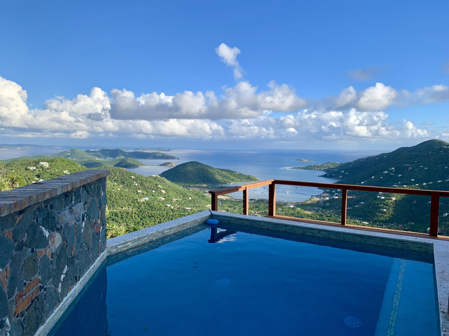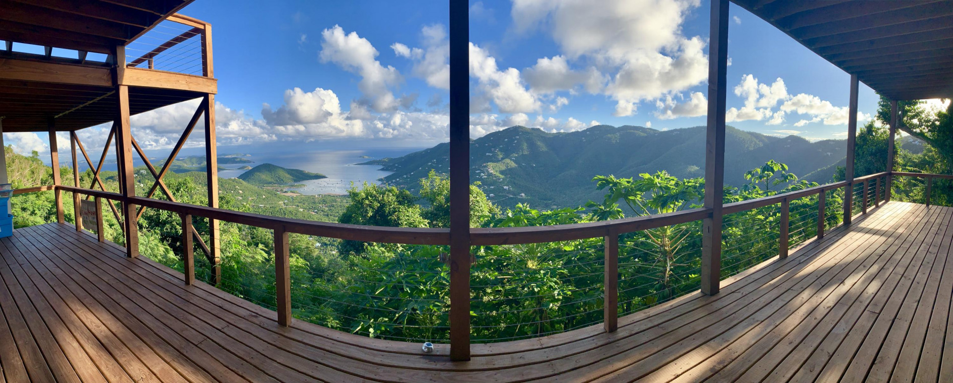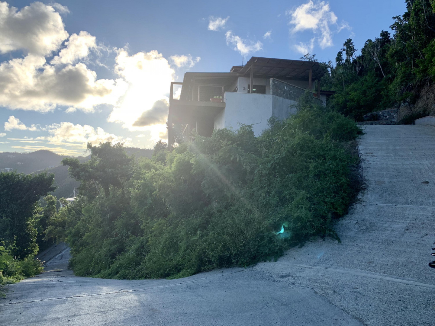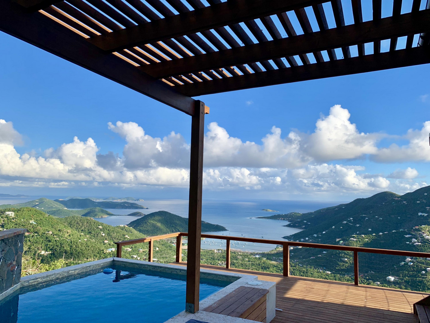 Villa Orenda - a concrete fortress sitting high on the hillside of coveted Ajax Peak with panoramic views that will take your breath away. Just minutes from the white sand North Shore beaches, this home is a true must-see, with solar panels powering 3/4 of the house. Orenda is an ideal layout for families, as all master suites are under one roof with interior access. A tasteful island stone entryway welcomes you to this newly constructed home with an incredible view from each of the hurricane rated windows and doors. Gaze down into Coral Bay harbor and beyond to the BVI, or across the lush valley views from 2 expansive decks featuring modern cable railings and a pool. Don't miss out on this opportunity! -