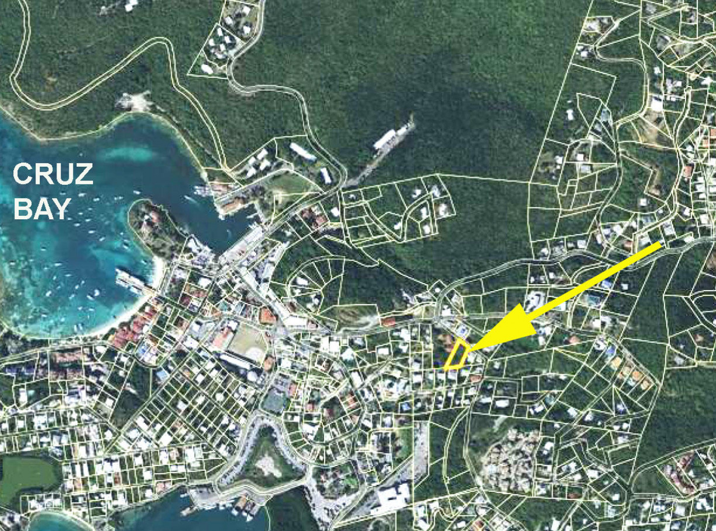 Development lot in town just off Centerline Road with nice water views to the south west. Short walk to down town Cruz Bay and a gentle down hill slope for an easy build. R-3 zoning allows for a hotel or guest house, condos or apartments. Adjoins Grassy Hill ( MLS #19-267) so would make a good combination of properties for development. Public water and sewer available.